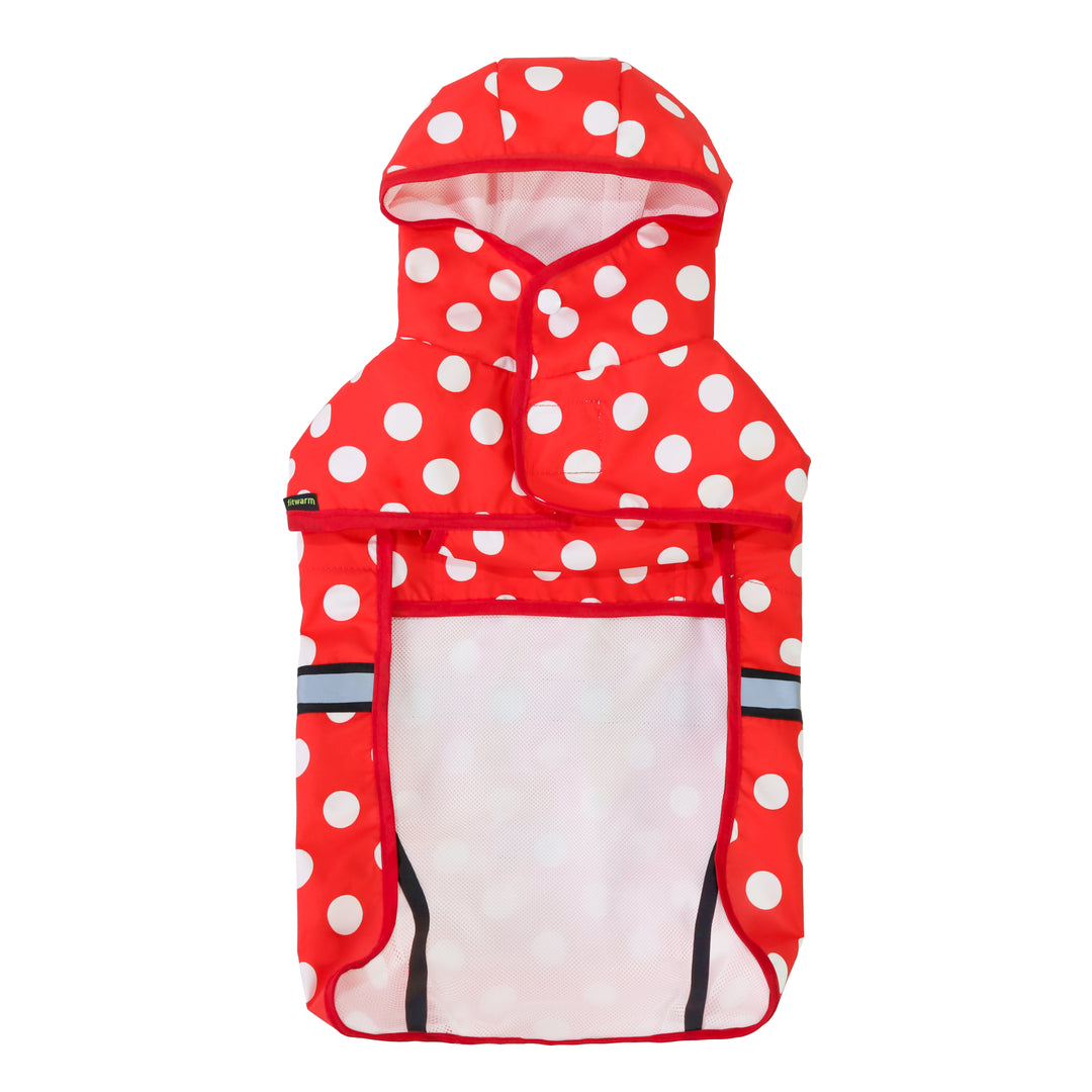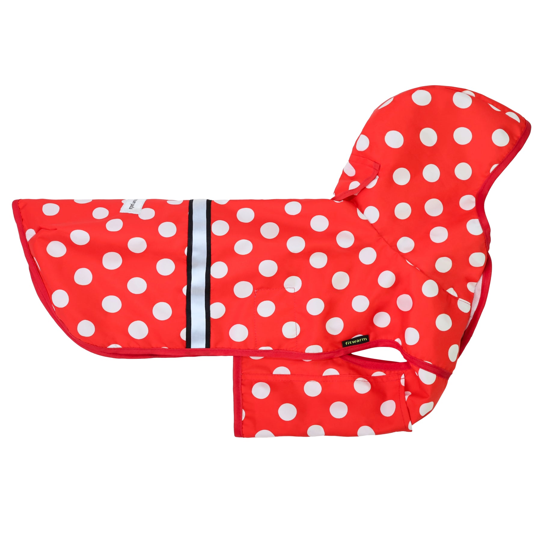 Red polka dot dog raincoat by Fitwarm with reflective strip, for small dogs.