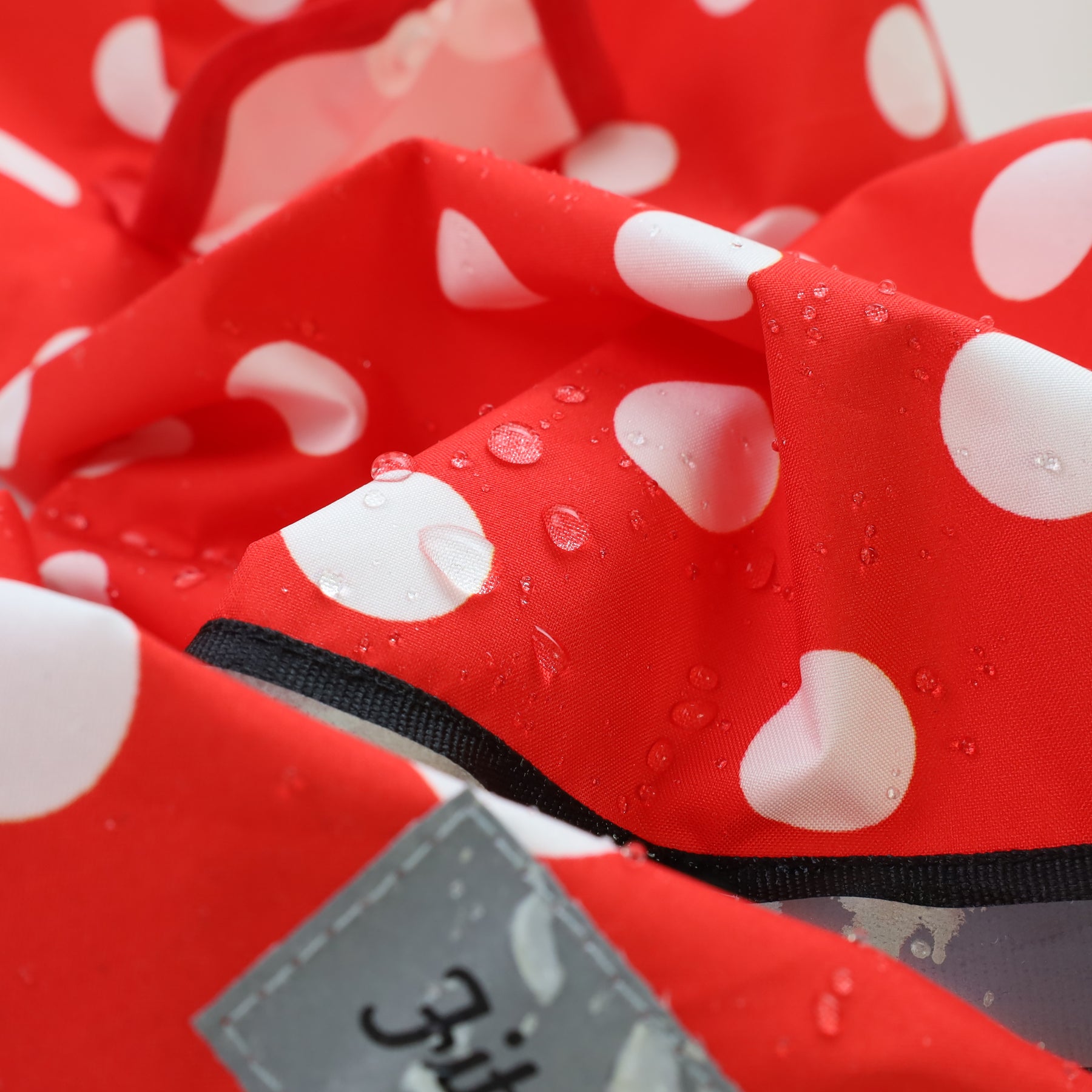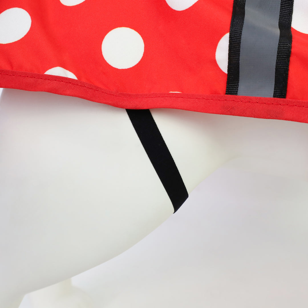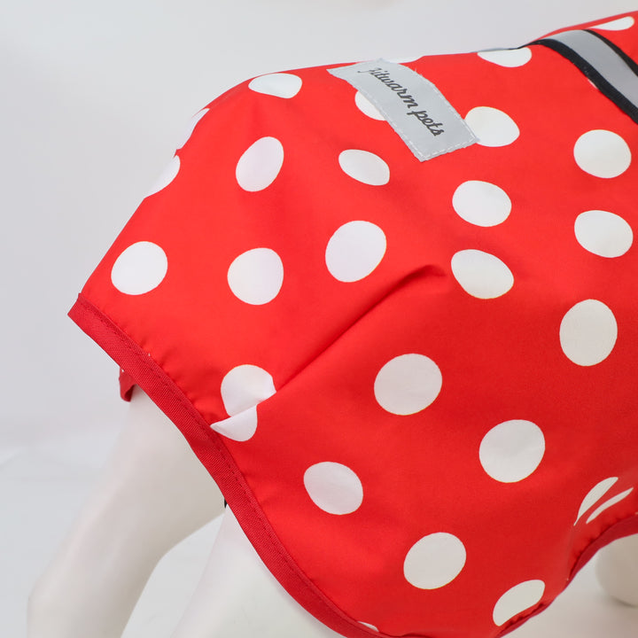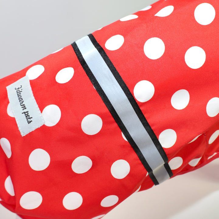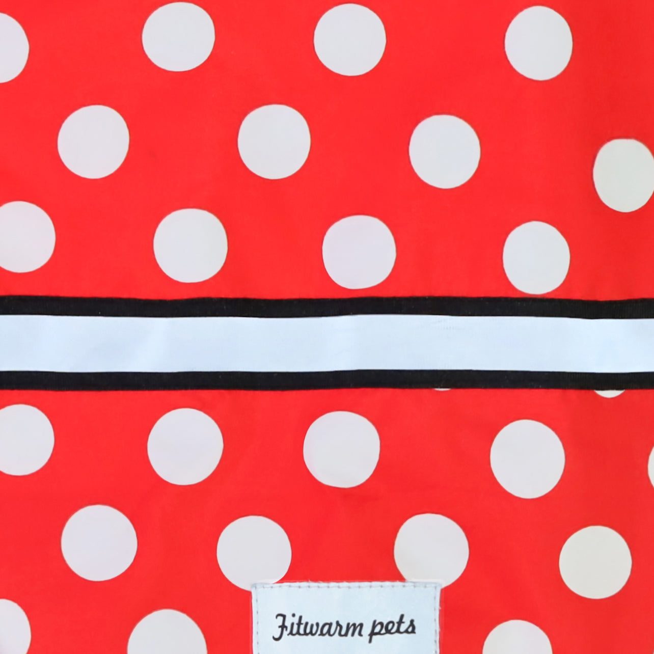 Red polka dot dog raincoat detail with reflective strip by Fitwarm