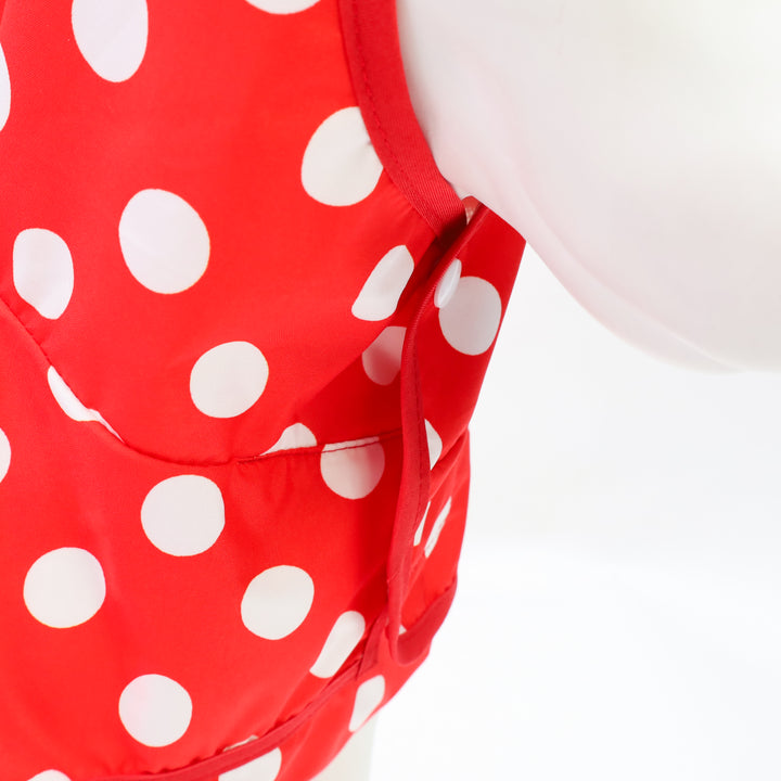 Red polka dot dog raincoat detail with white spots and button. Waterproof and fashionable.