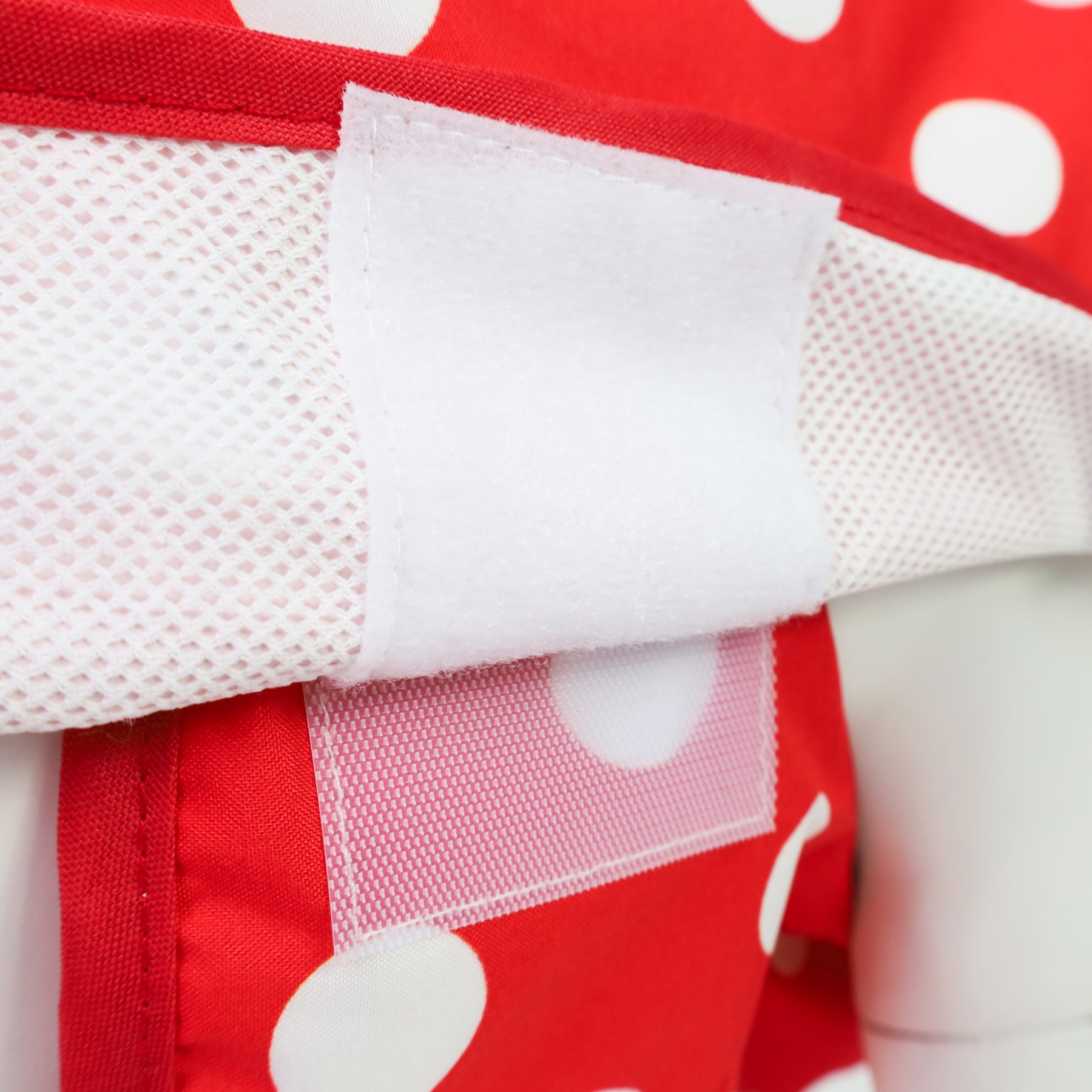 Red polka dot dog raincoat detail: Hook-and-loop closure, mesh lining. Waterproof and windproof for small dogs.