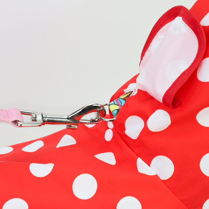 Polka dot dog raincoat detail: red with white spots and a harness attachment