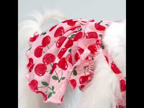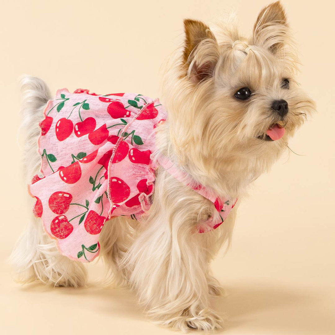 Cute cherry print dog dress in pink with ruffled skirt, for small girl dogs, lightweight and breathable.