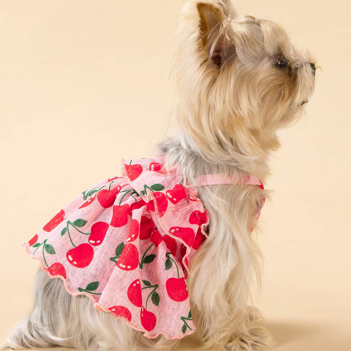 Cherry print dog dress, pink with ruffled skirt, lightweight and breathable for small dogs