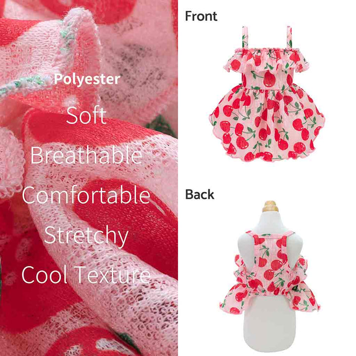 Cherry print dog dress, pink, ruffled off-shoulder, made of breathable and comfortable polyester fabric for small dogs