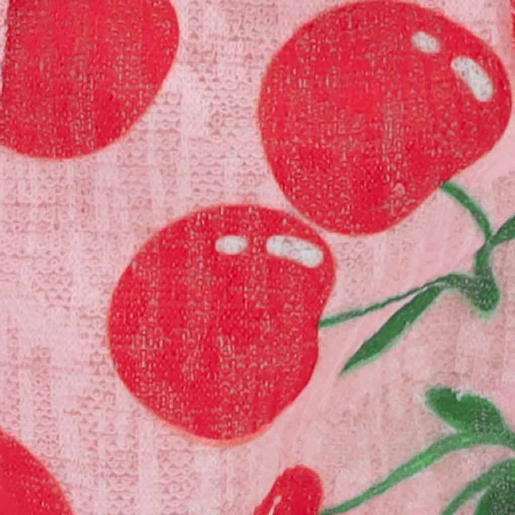 Cherry print fabric detail for small dog dress, featuring red cherries on pink background, lightweight and breathable