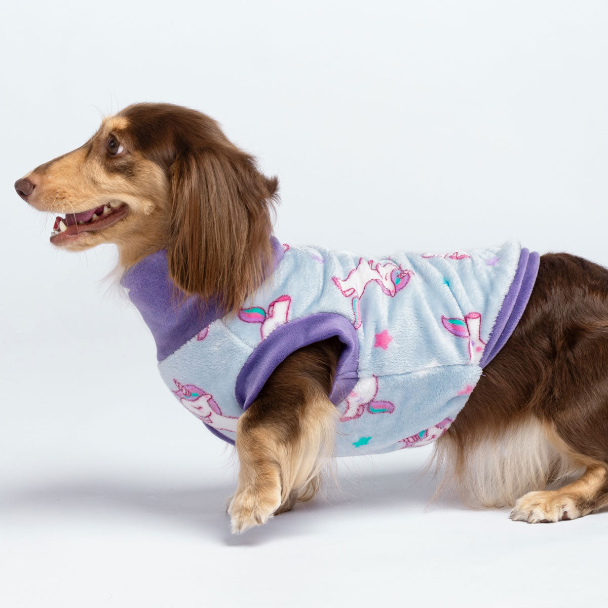 Dachshund dog in light blue unicorn fleece sweater with purple turtleneck, perfect for chilly days, thermal, and warm