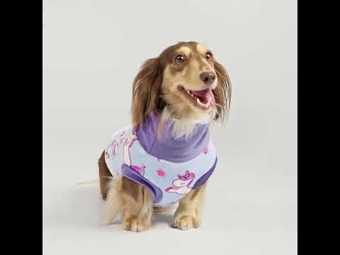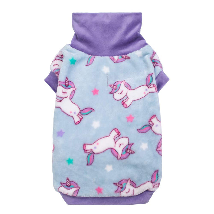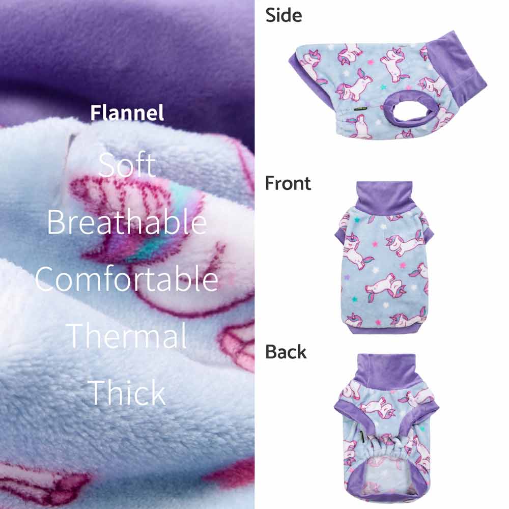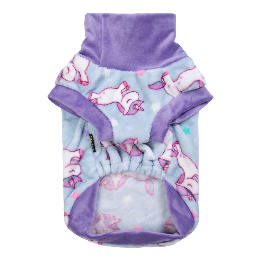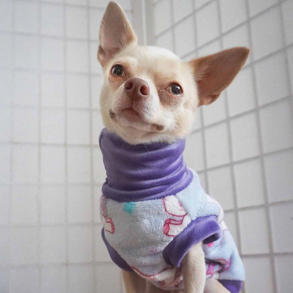 Unicorn fleece dog sweater: soft, breathable flannel. Thermal dog clothes with purple turtleneck for small dogs.