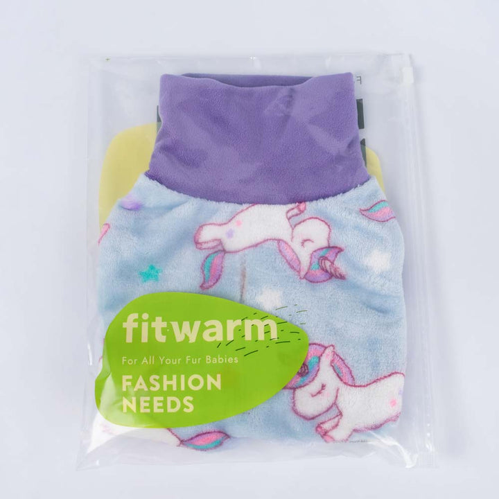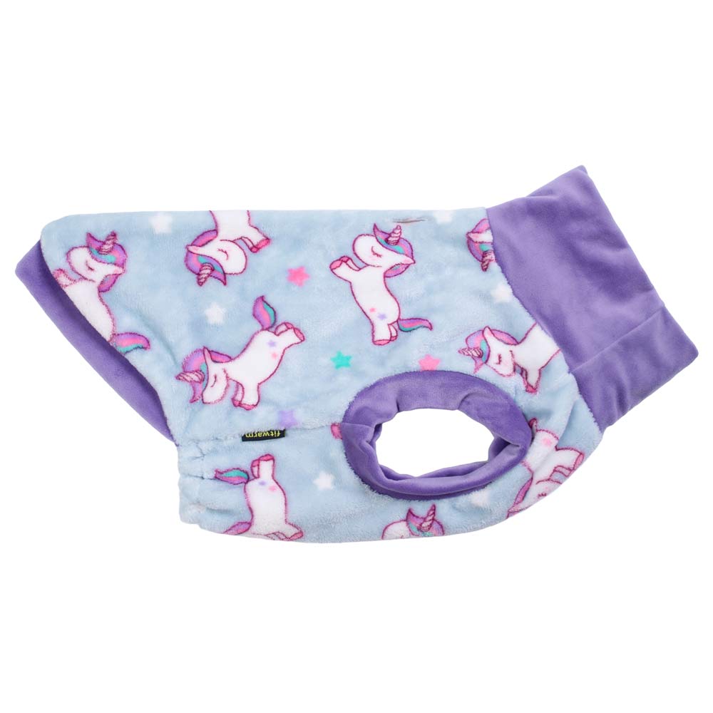 Fitwarm unicorn dog sweater in package, light blue fleece with unicorn print and purple turtleneck, cozy winter clothes.