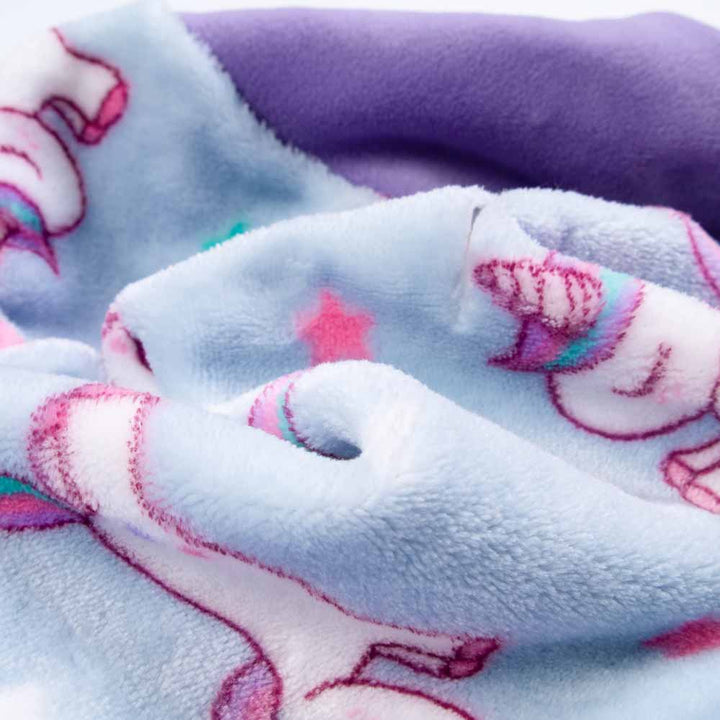Close-up of blue unicorn fleece dog sweater with purple turtleneck, thermal and cozy.