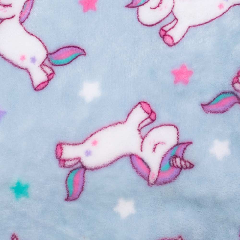 Close-up of soft light blue fleece with unicorn and star pattern, for unicorn dog sweater.
