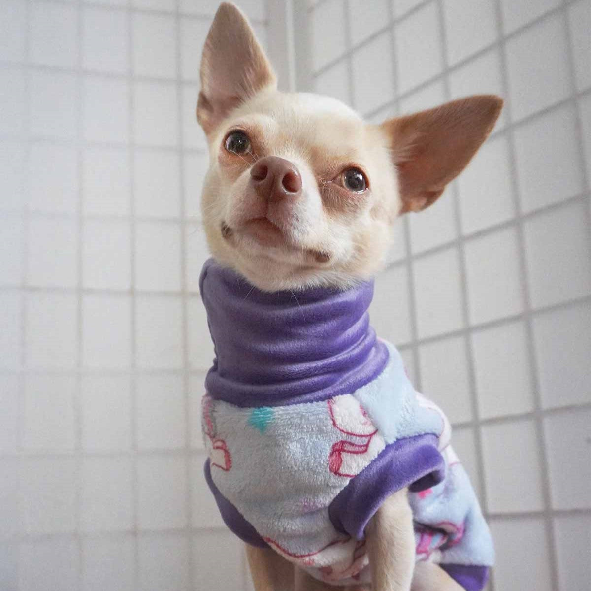 Chihuahua in purple unicorn fleece dog sweater, ideal for small dogs' warmth and style