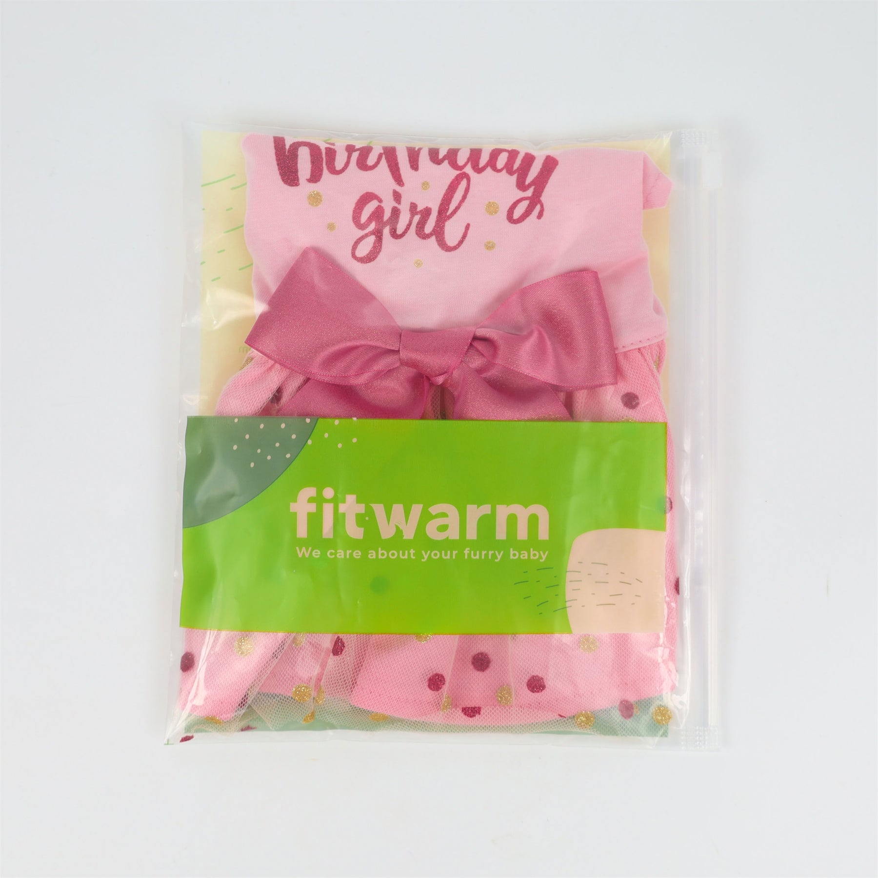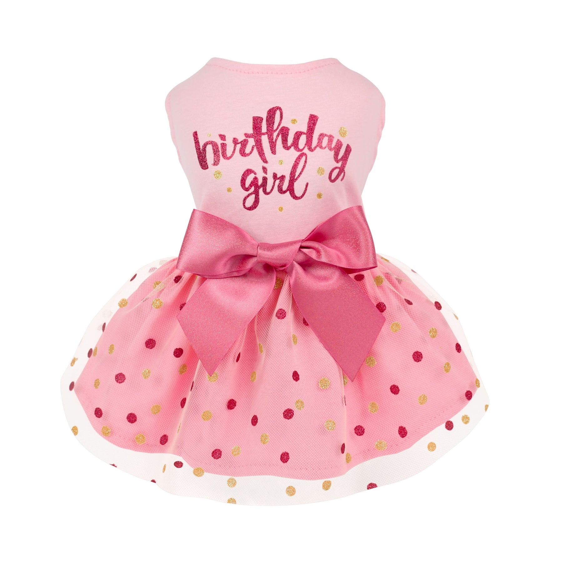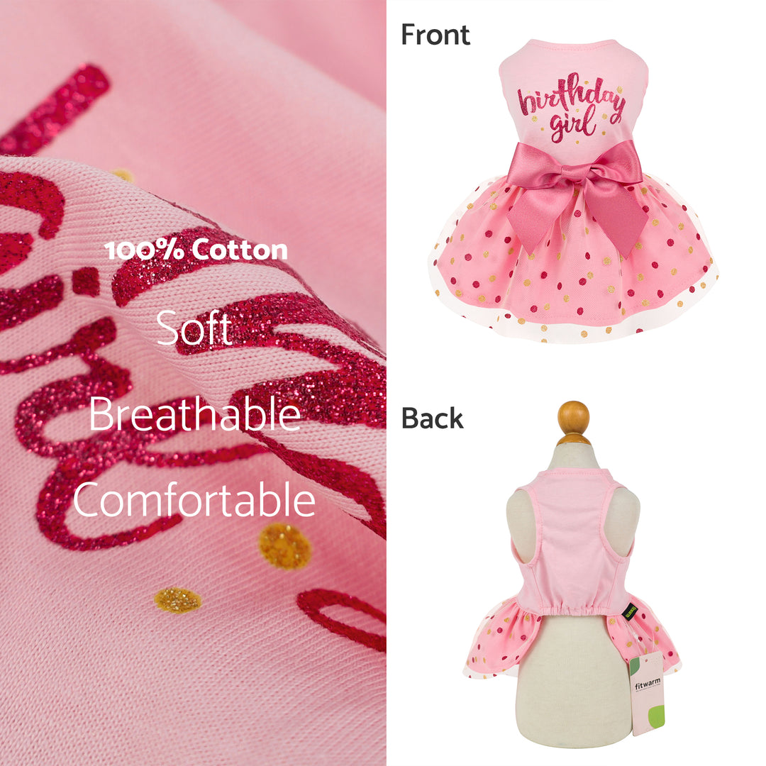 Fitwarm Birthday Girl dog dress, pink cotton dress with tulle skirt, perfect for special occasions and birthday parties.