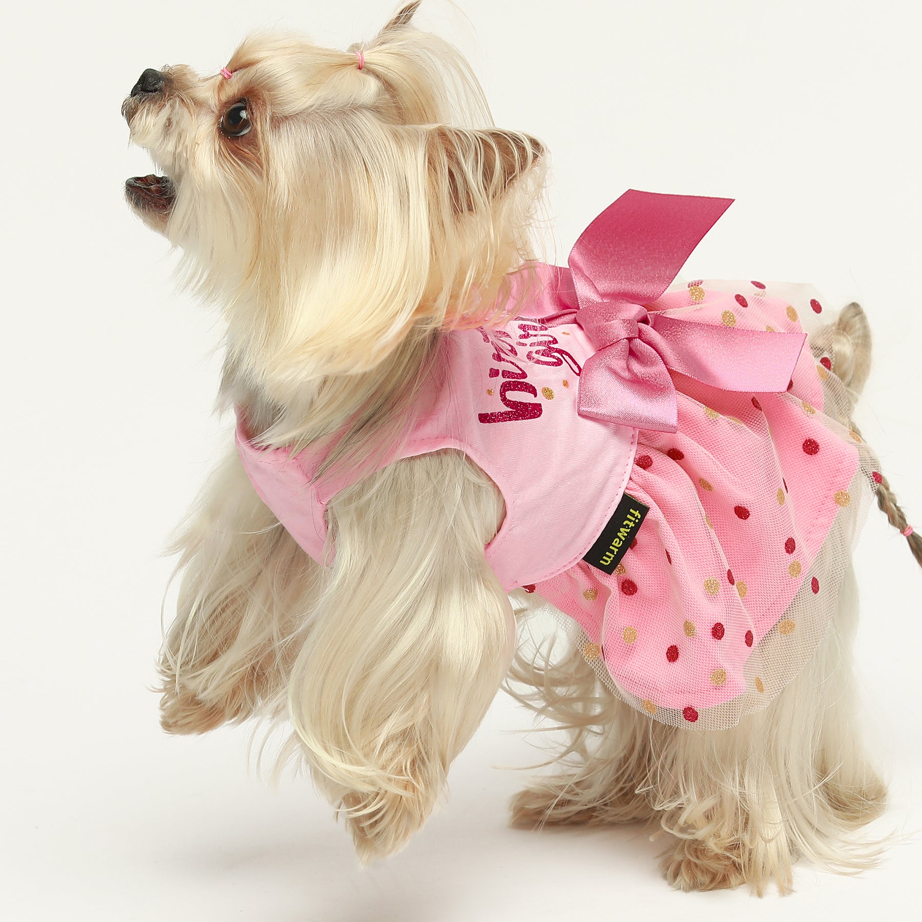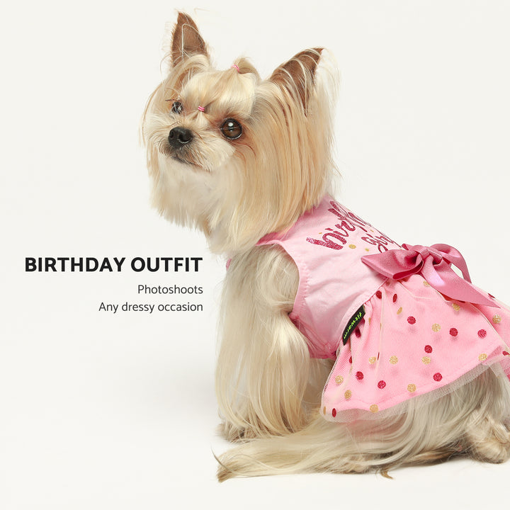 Pink Birthday Girl dog dress with bowknot and polka dot tulle skirt, Fitwarm apparel