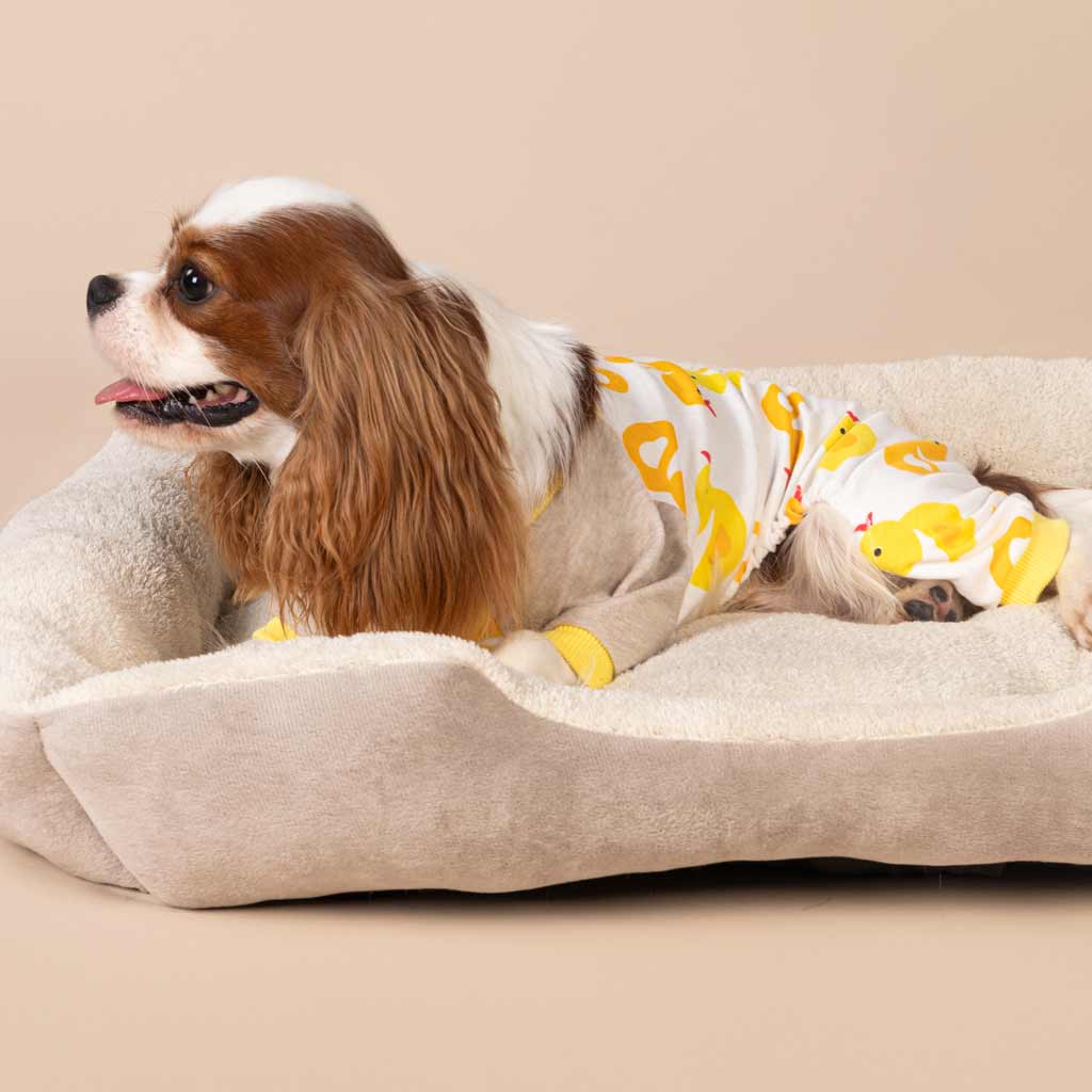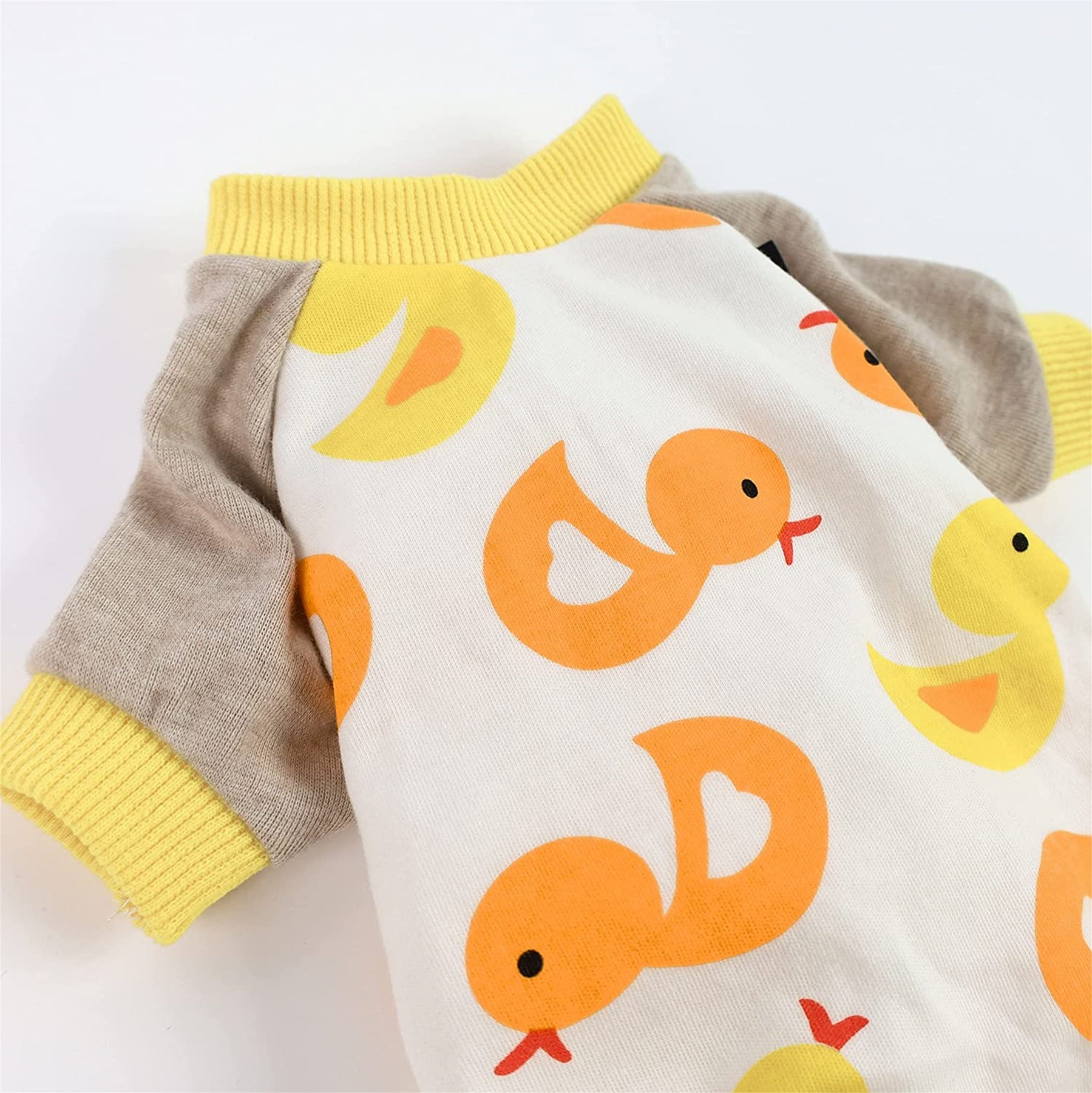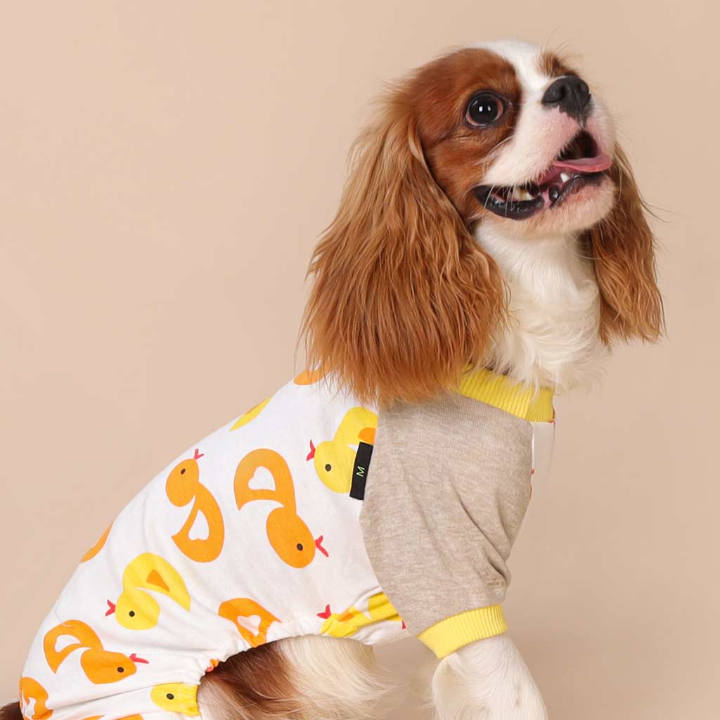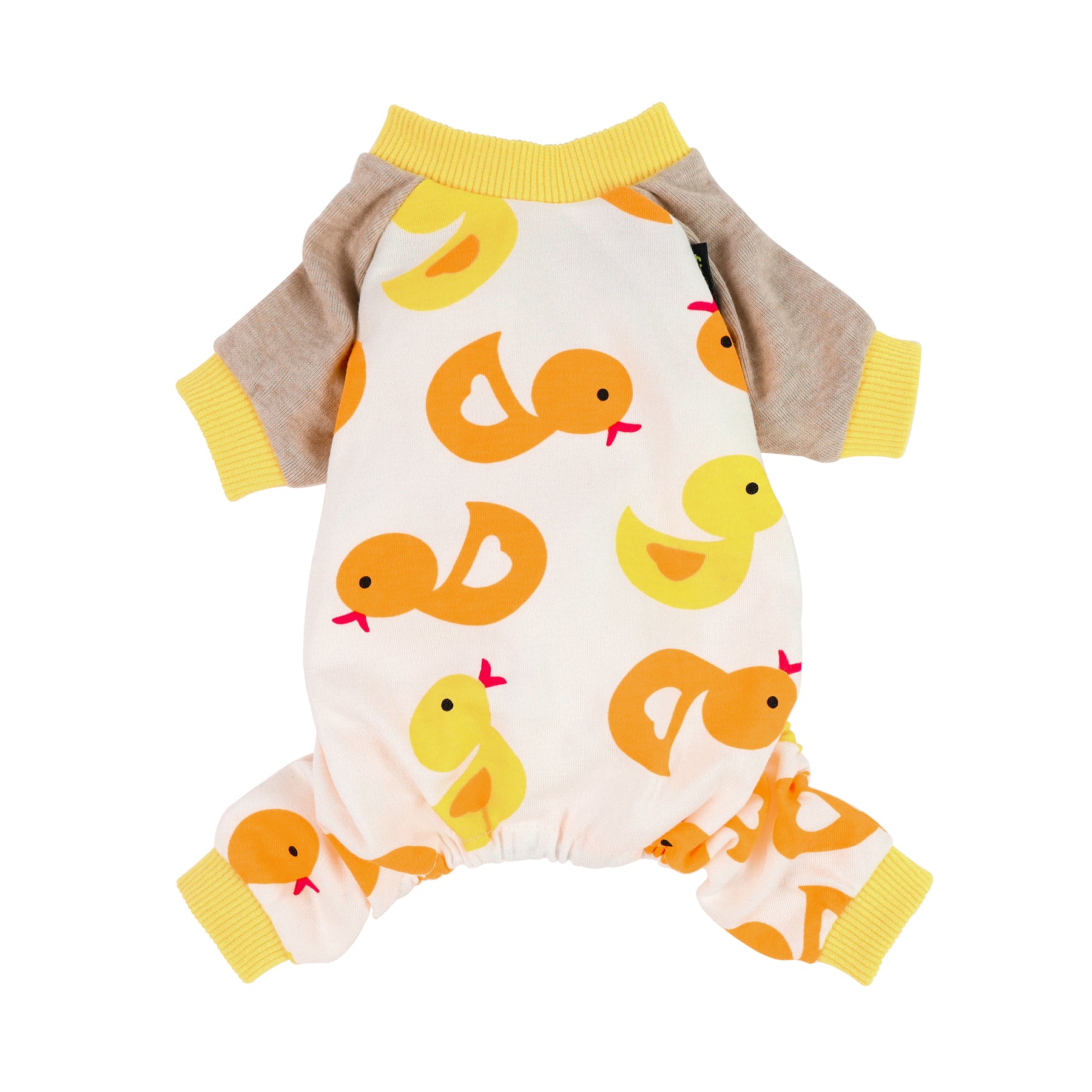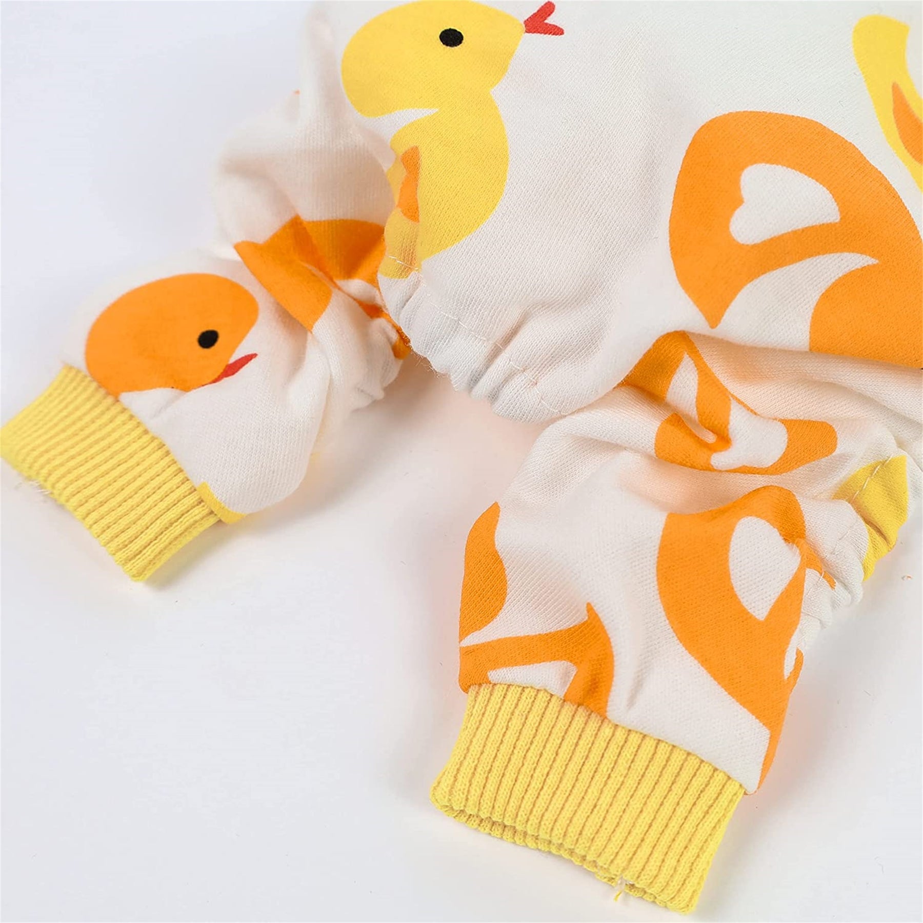 White 100% cotton dog pajamas with raglan sleeves and yellow trim, featuring a repeating pattern of orange and yellow ducks.