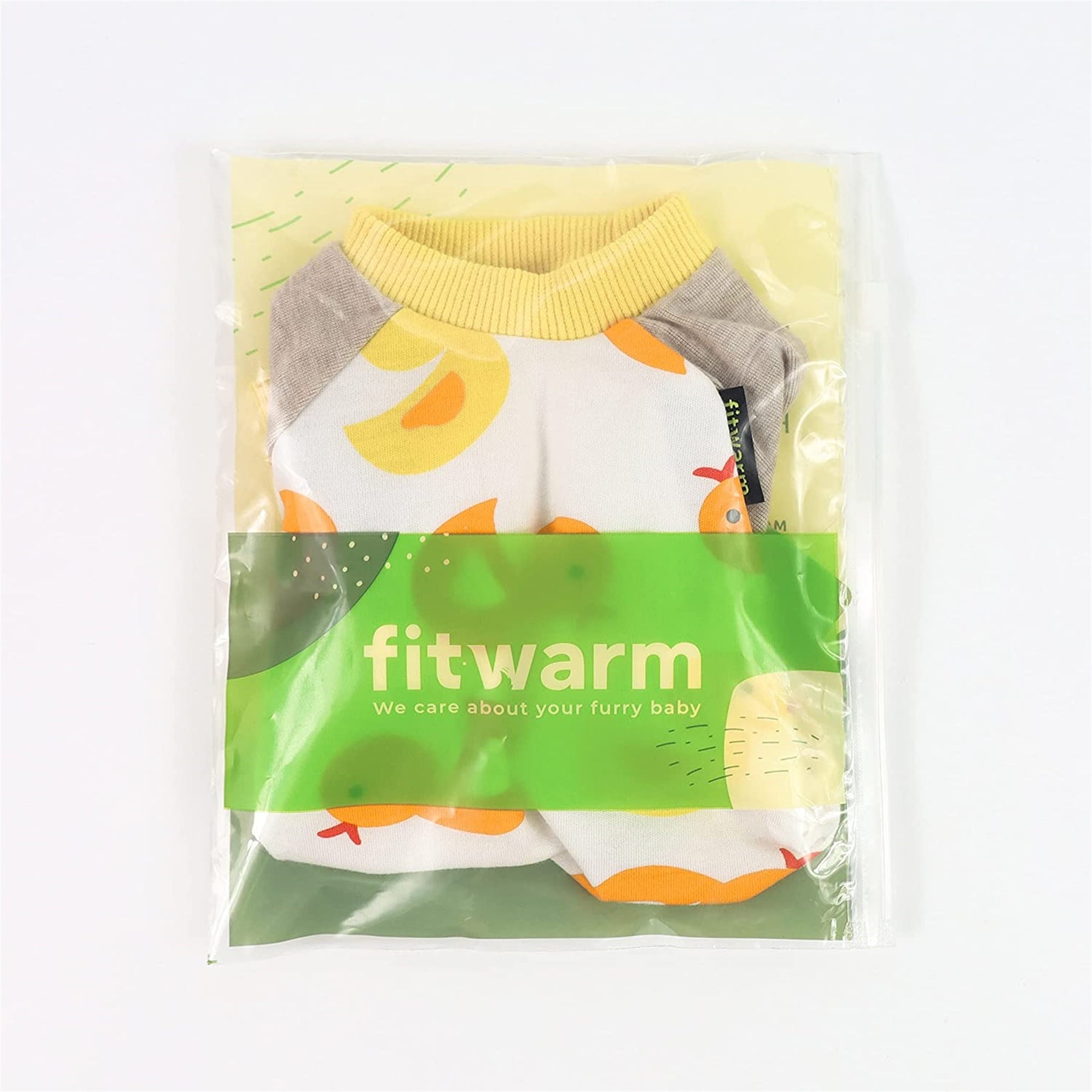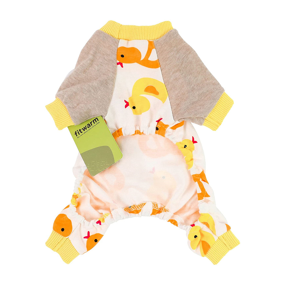 Funny duck print dog pajamas with yellow cuffs and collar, raglan sleeves, and a fitwarm brand tag.
