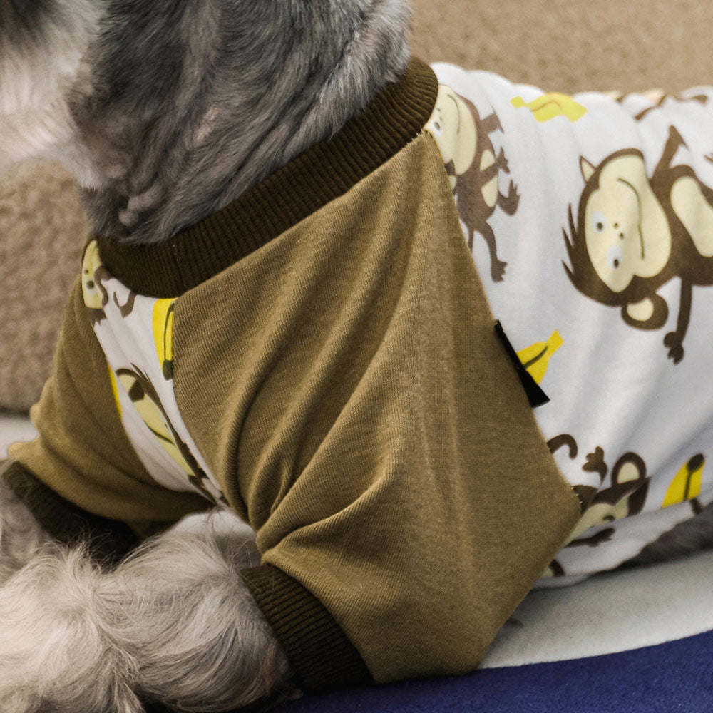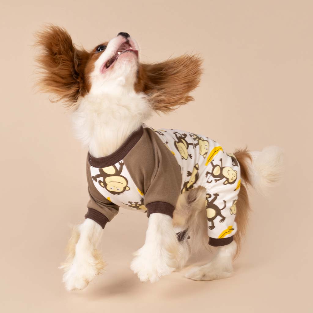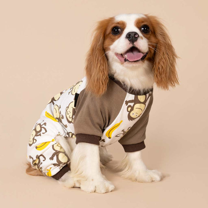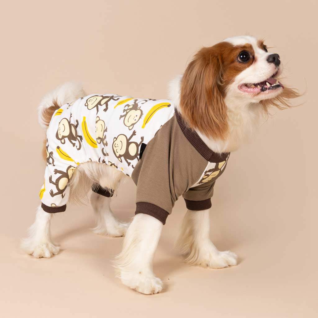 Light cream dog pajamas with a monkey and banana print, featuring brown ribbed cuffs and collar.