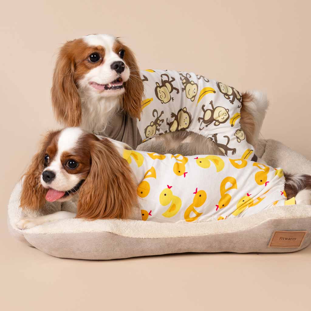 Two Cavalier King Charles Spaniels in monkey and duck print dog pajamas on Fitwarm pet bed.