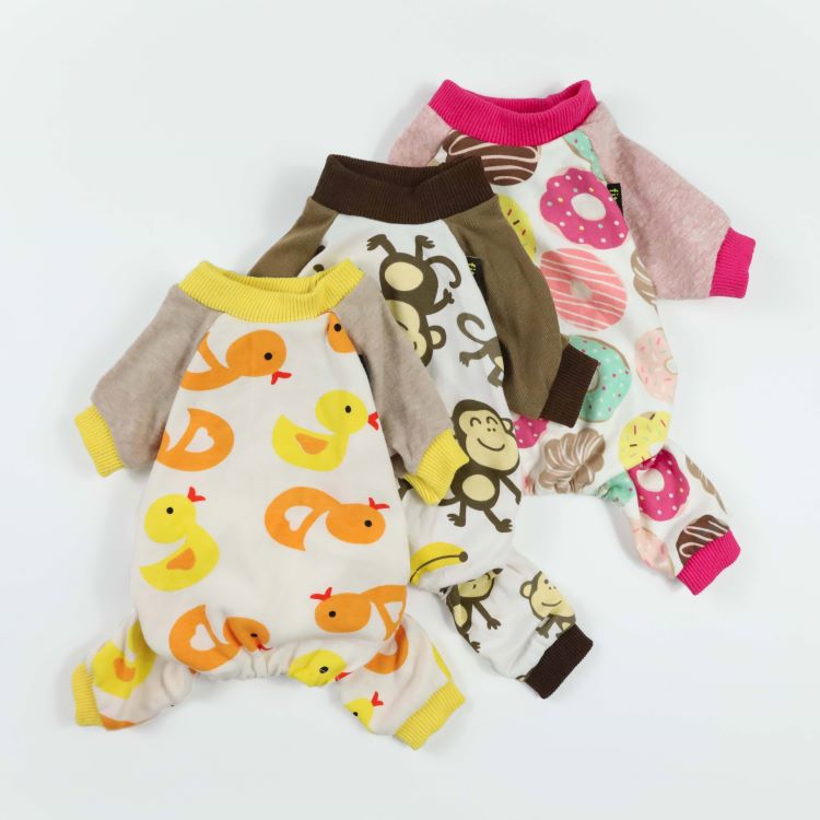Three cozy dog pajamas with playful prints: ducks, monkeys, and donuts.