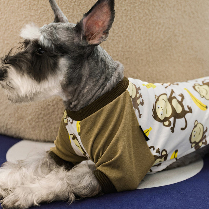 Schnauzer dog wearing white monkey print pajamas with khaki sleeves and brown cuffs, showcasing comfortable pet sleepwear.