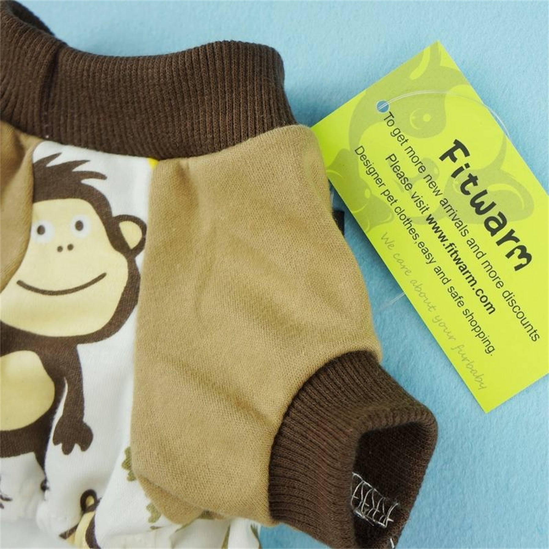 Fitwarm monkey print dog pajamas with brown cuffs and collar detail. Soft cotton material for pet sleepwear.
