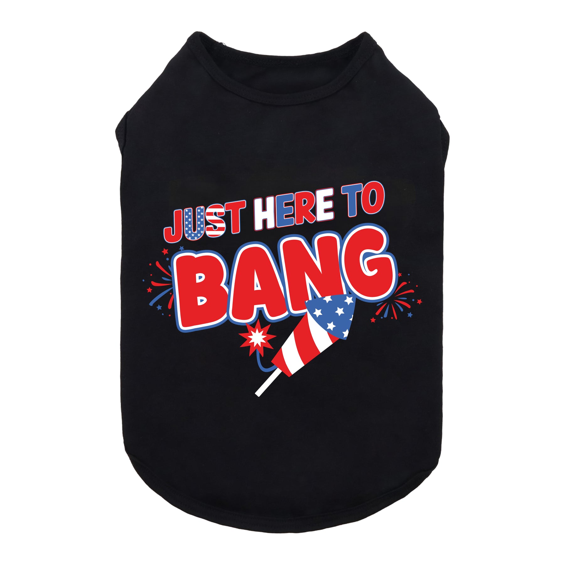 Black patriotic dog shirt with "JUST HERE TO BANG" text, fireworks, and a rocket graphic.