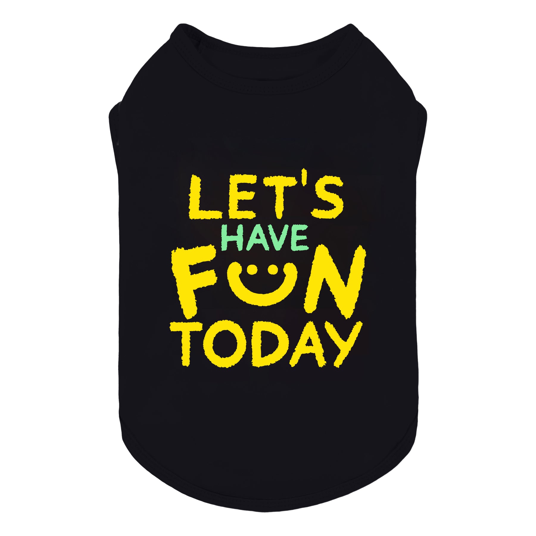 Playful dog shirts feature cheerful lettering that reads “LET’S HAVE FUN TODAY,” with a smiley face replacing the “U” for an extra touch of fun. Bright yellow and mint green letters pop beautifully against a dark background, creating an upbeat, casual look perfect for daily wear. Comfortable dog tank top offers a relaxed pullover fit, ideal for morning walk, outdoor play, or simply enjoying joyful moment with furry friends.
