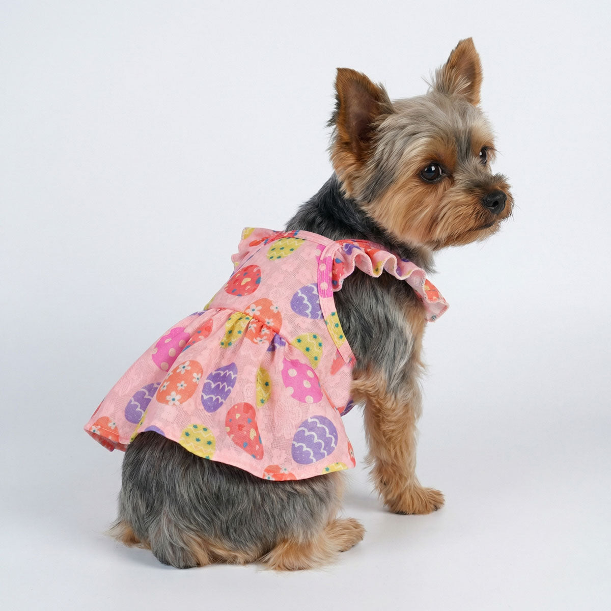 Easter dog dress with colorful egg patterns and ruffle sleeves. Ideal dog Easter outfit for spring.