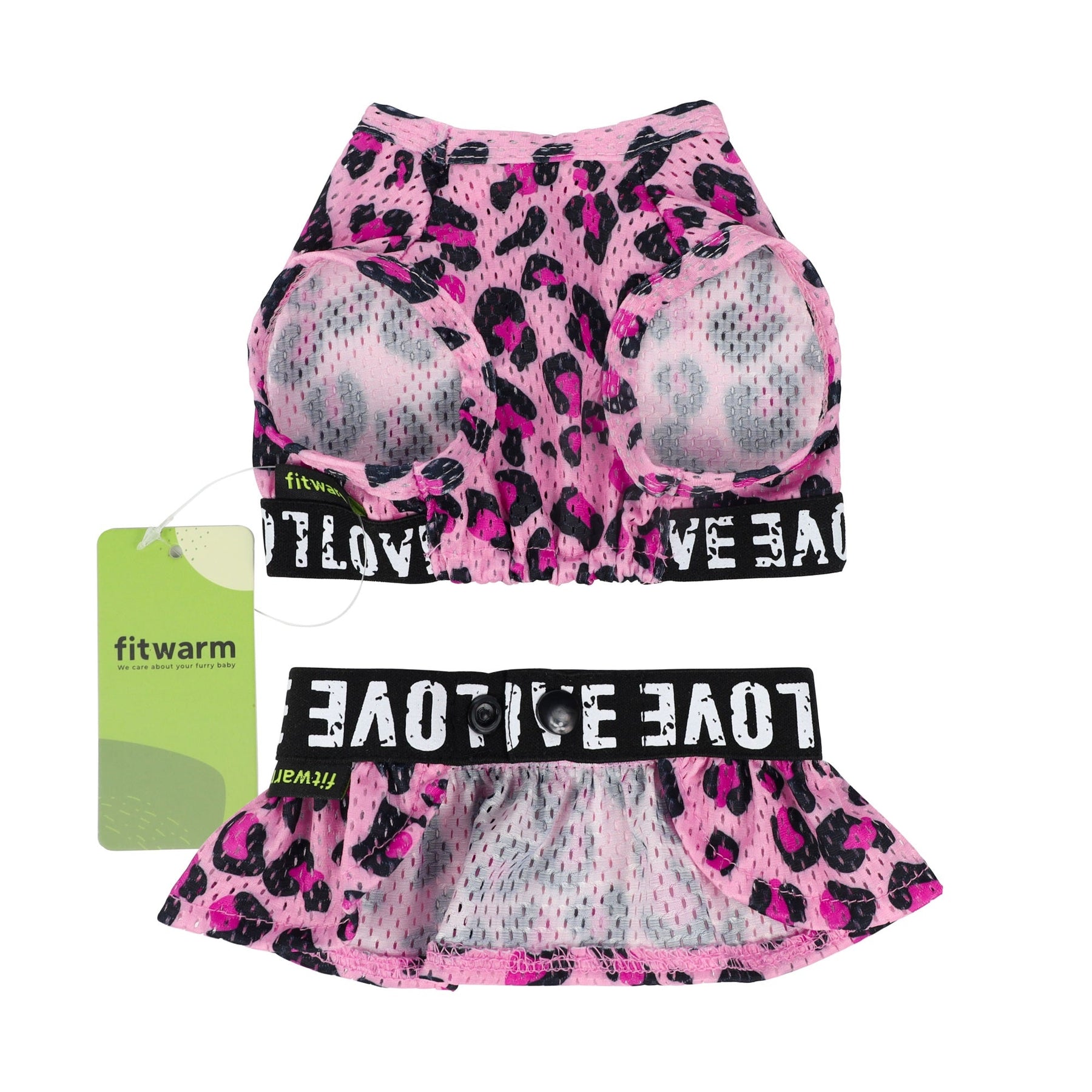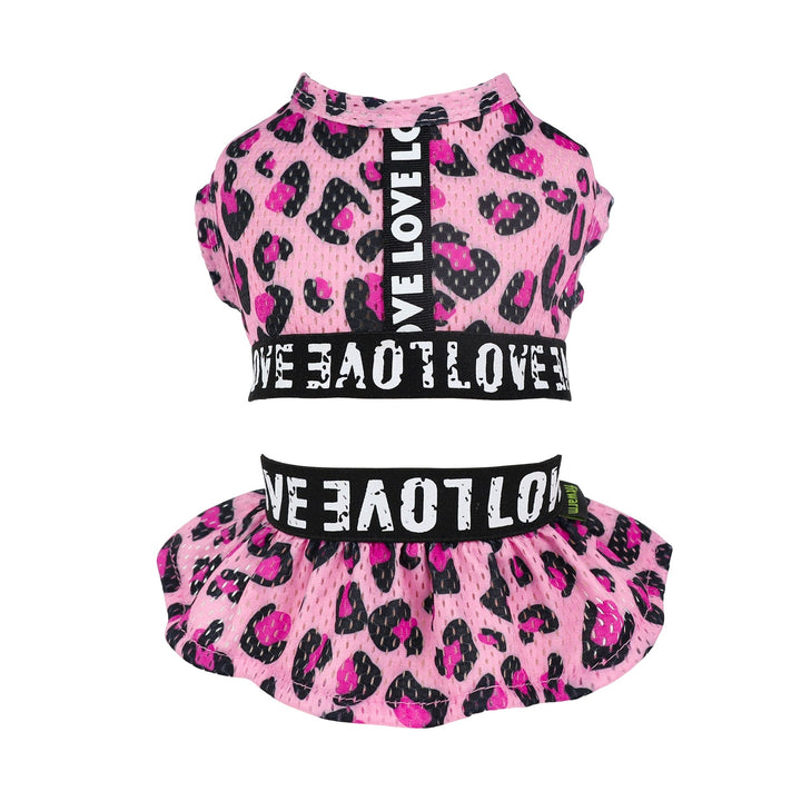 Leopard print athleisure dog dress with LOVE text. Pink top and mini skirt for small dogs and cats. Fitwarm brand.