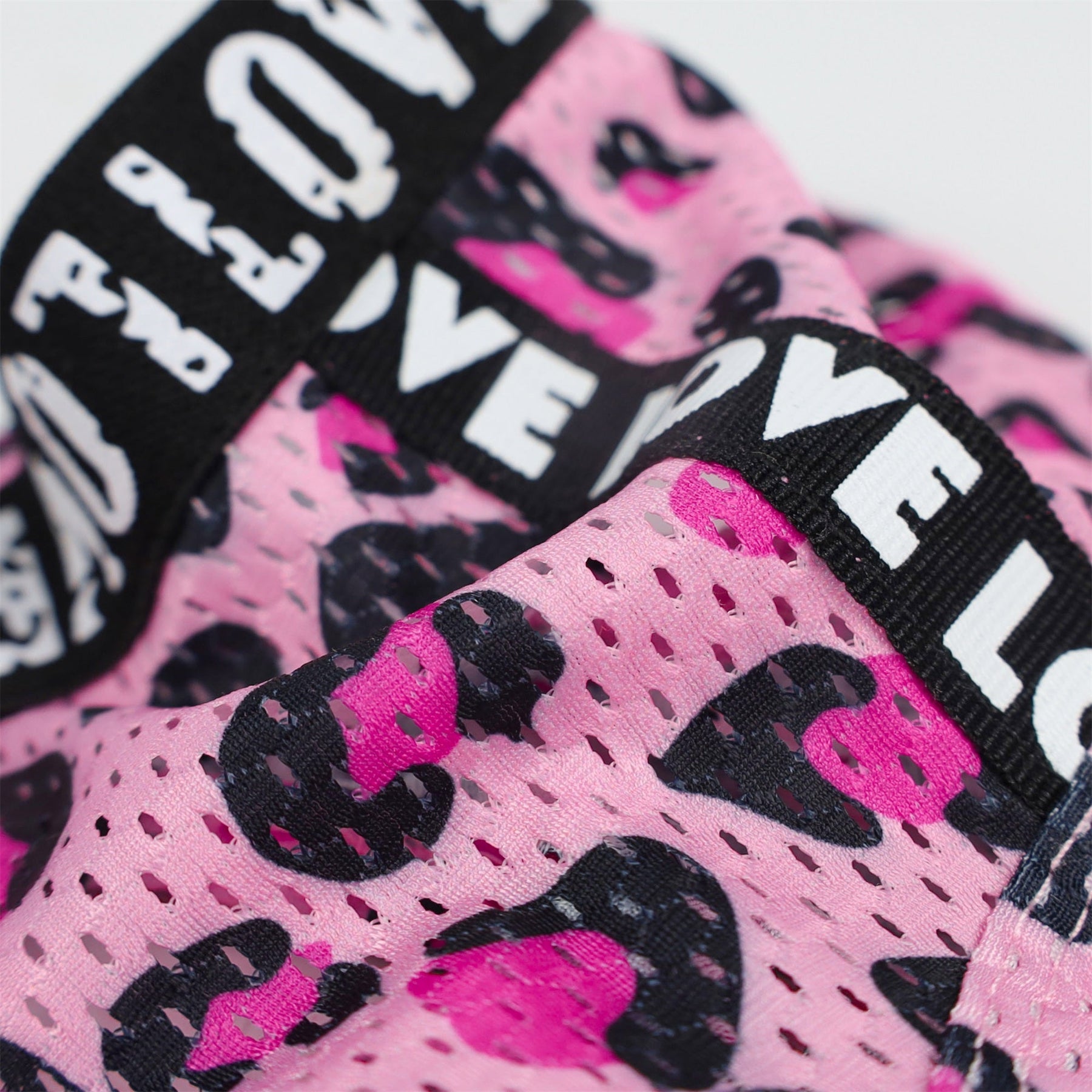 Pink leopard print dog dress detail with LOVE text. Athleisure design for small dogs and cats. Mesh fabric