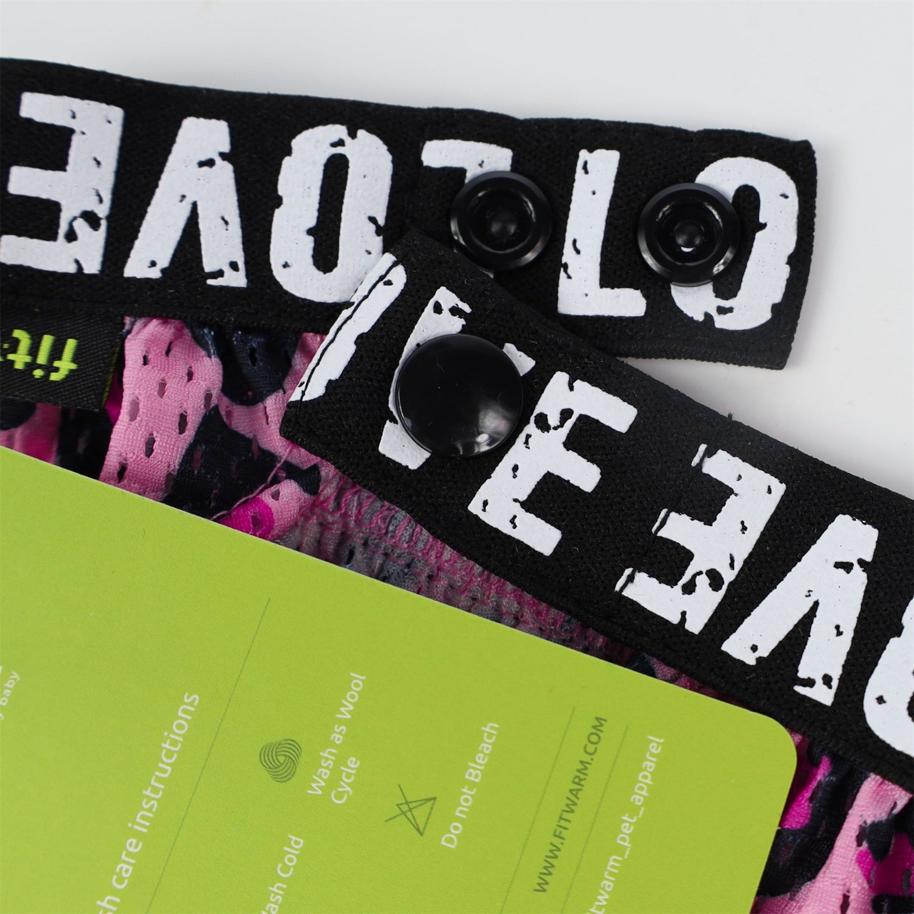 Fitwarm Leopard athleisure dog dress detail. Black "LOVE" waistband, pink leopard print, and care label.