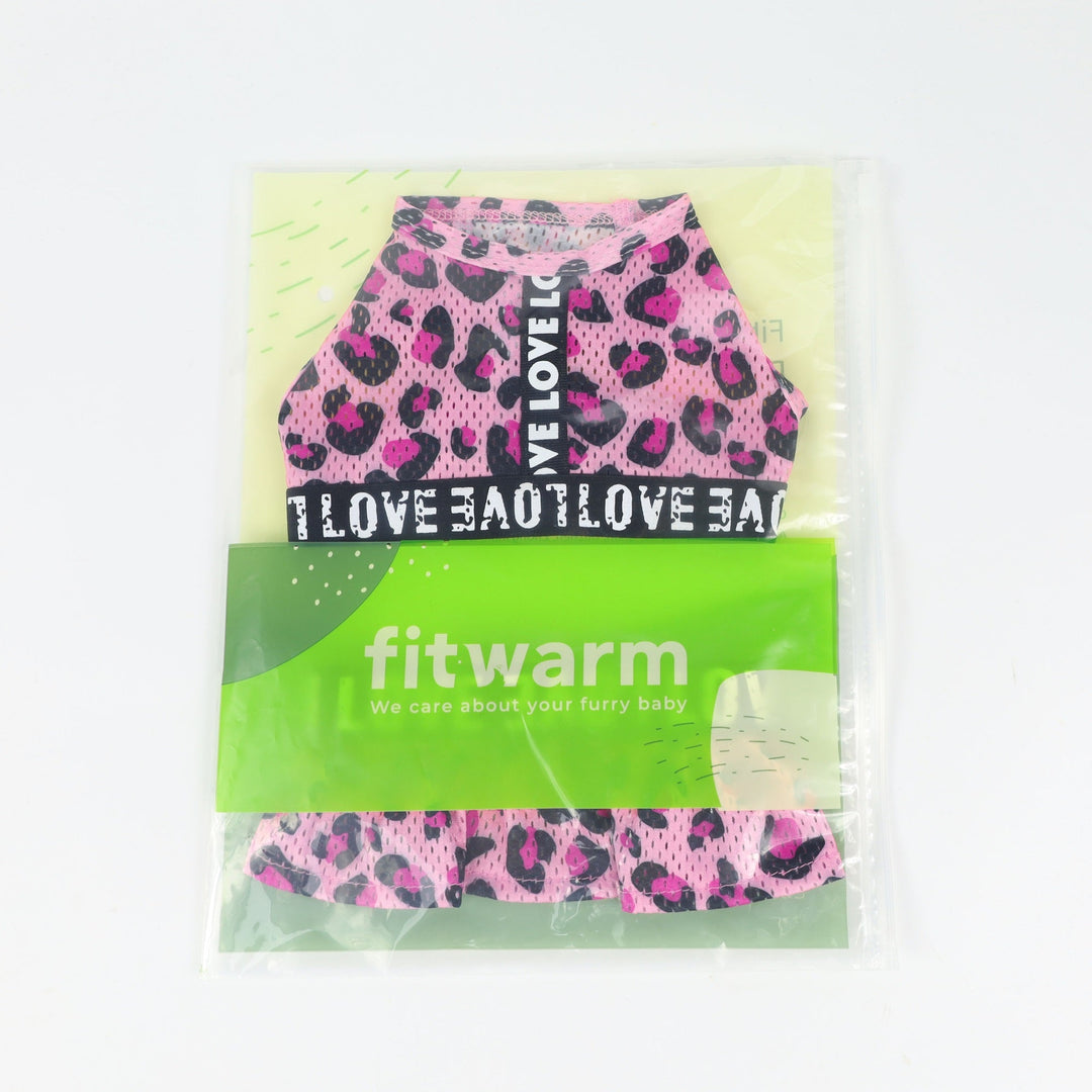 Fitwarm Leopard print dog dress with "LOVE" text, pink athleisure outfit for small dogs and cats, mesh fabric
