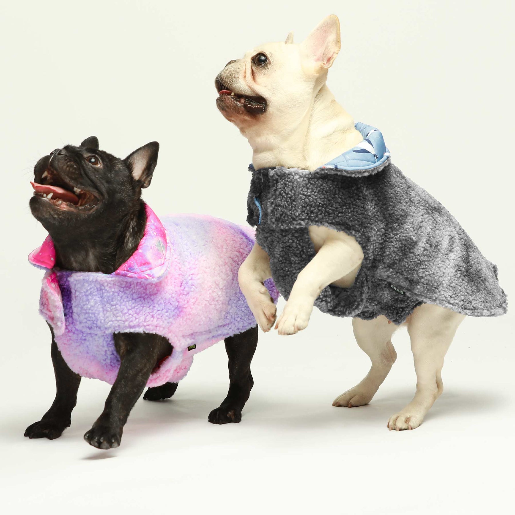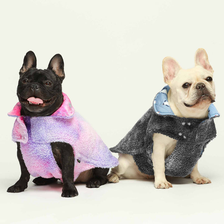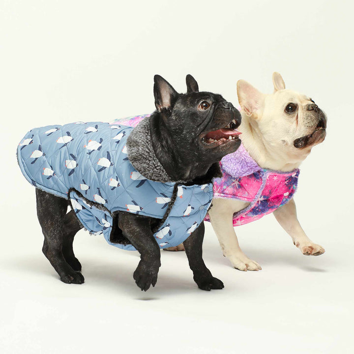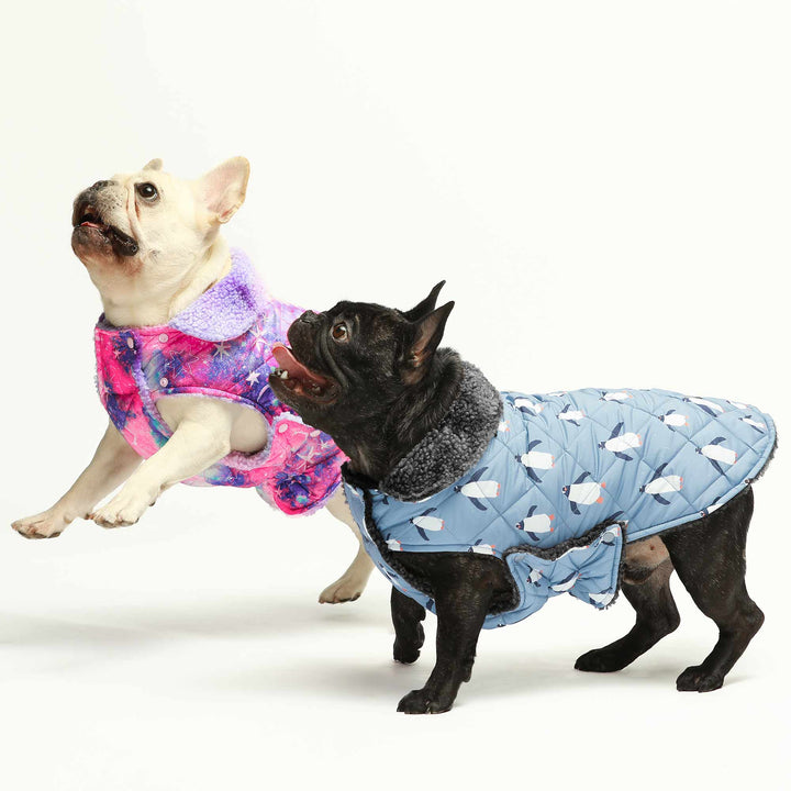 Reversible dog coats for French Bulldogs. Galaxy and penguin print winter apparel by Fitwarm.