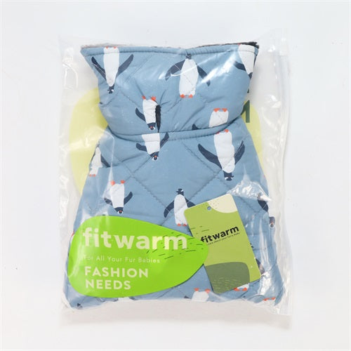 Penguin print waterproof dog coat with sherpa lining, perfect for winter. Fitwarm dog apparel.