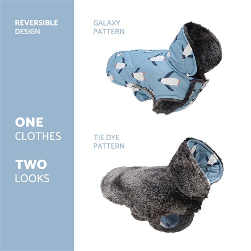 Reversible galaxy/penguin dog coat: quilted padded fabric, soft, breathable, thermal. Front and back views.