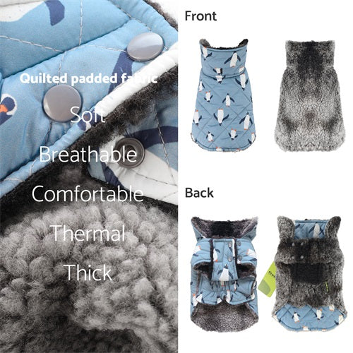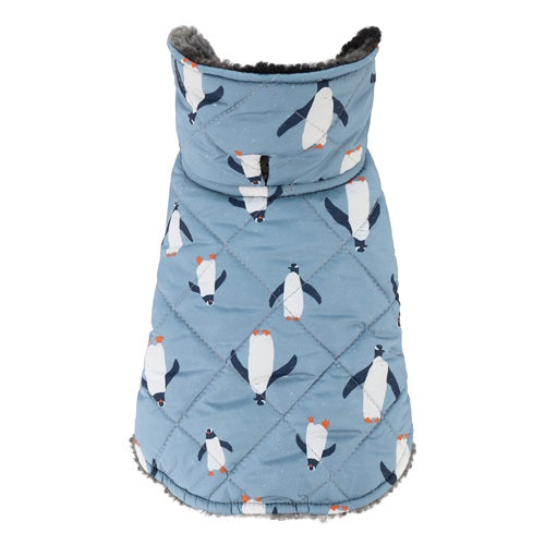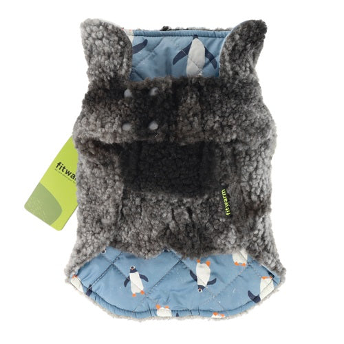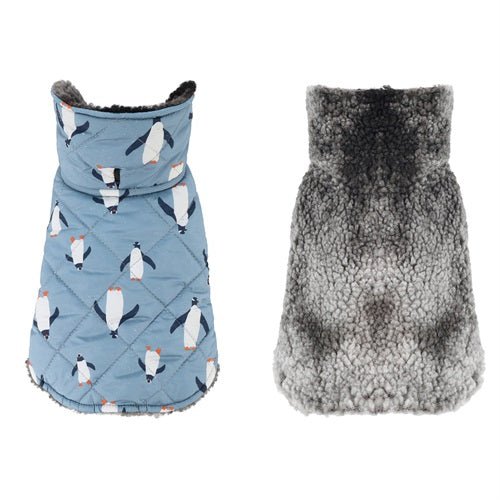 Reversible penguin dog coat with sherpa lining and quilted design. Fitwarm winter apparel for dogs.