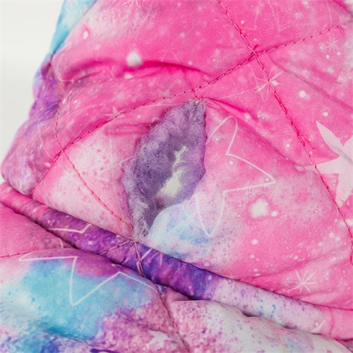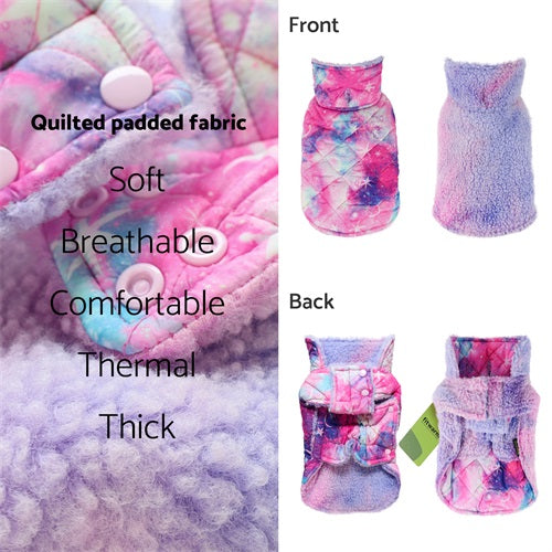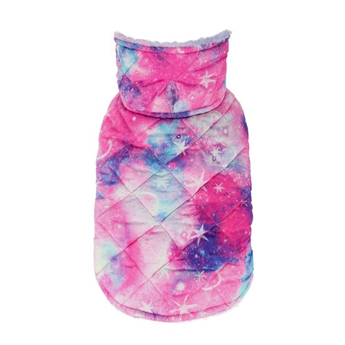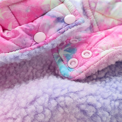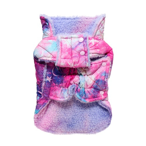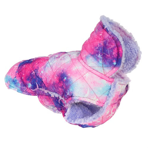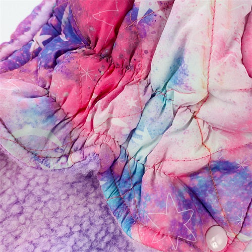 Quilted pink, purple, and blue galaxy print dog coat with sherpa lining and pink snap buttons.