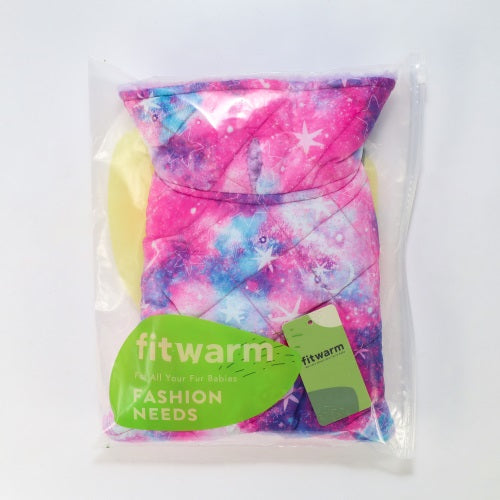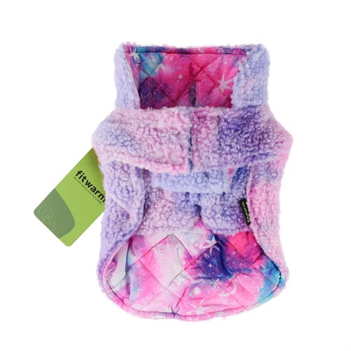 Galaxy print reversible dog coat, pink/blue galaxy pattern, quilted, sherpa lining visible. "fitwarm" logo.