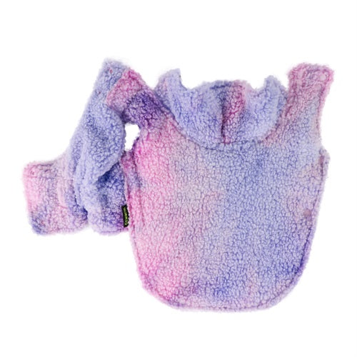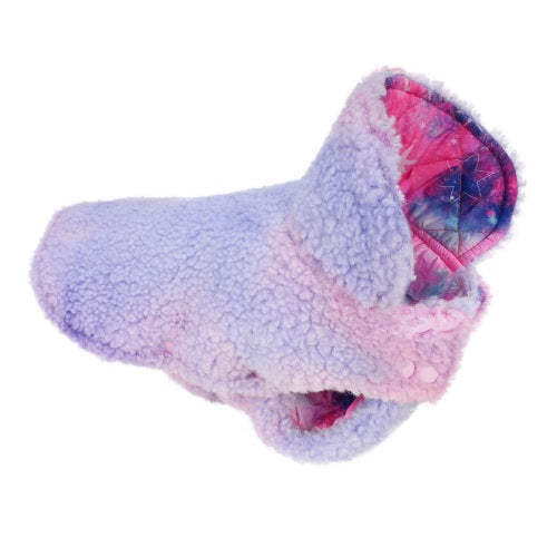 Reversible dog coat with galaxy print lining and fluffy purple/pink exterior.