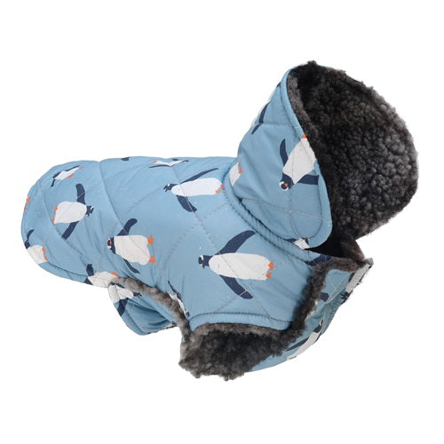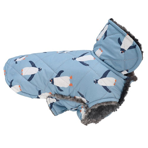Penguin print dog coat detail. Blue quilted exterior with sherpa lining. Winter apparel from Fitwarm.