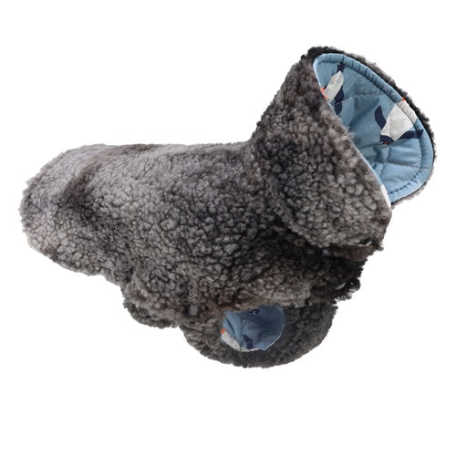 Reversible dog coat with gray sherpa fleece and blue interior, winter apparel for dogs.
