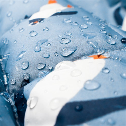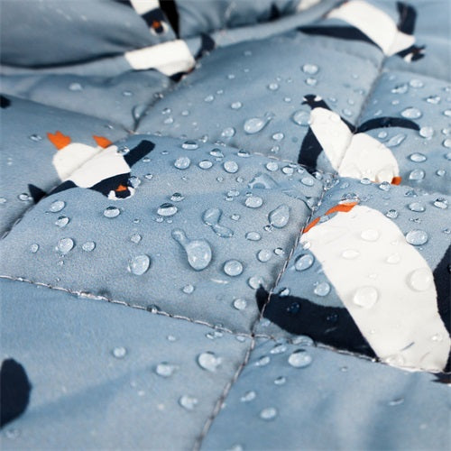 Waterproof dog coat detail with penguin print and water droplets, winter apparel