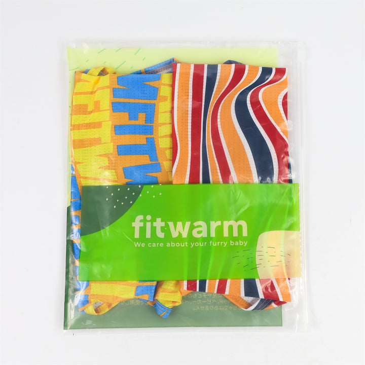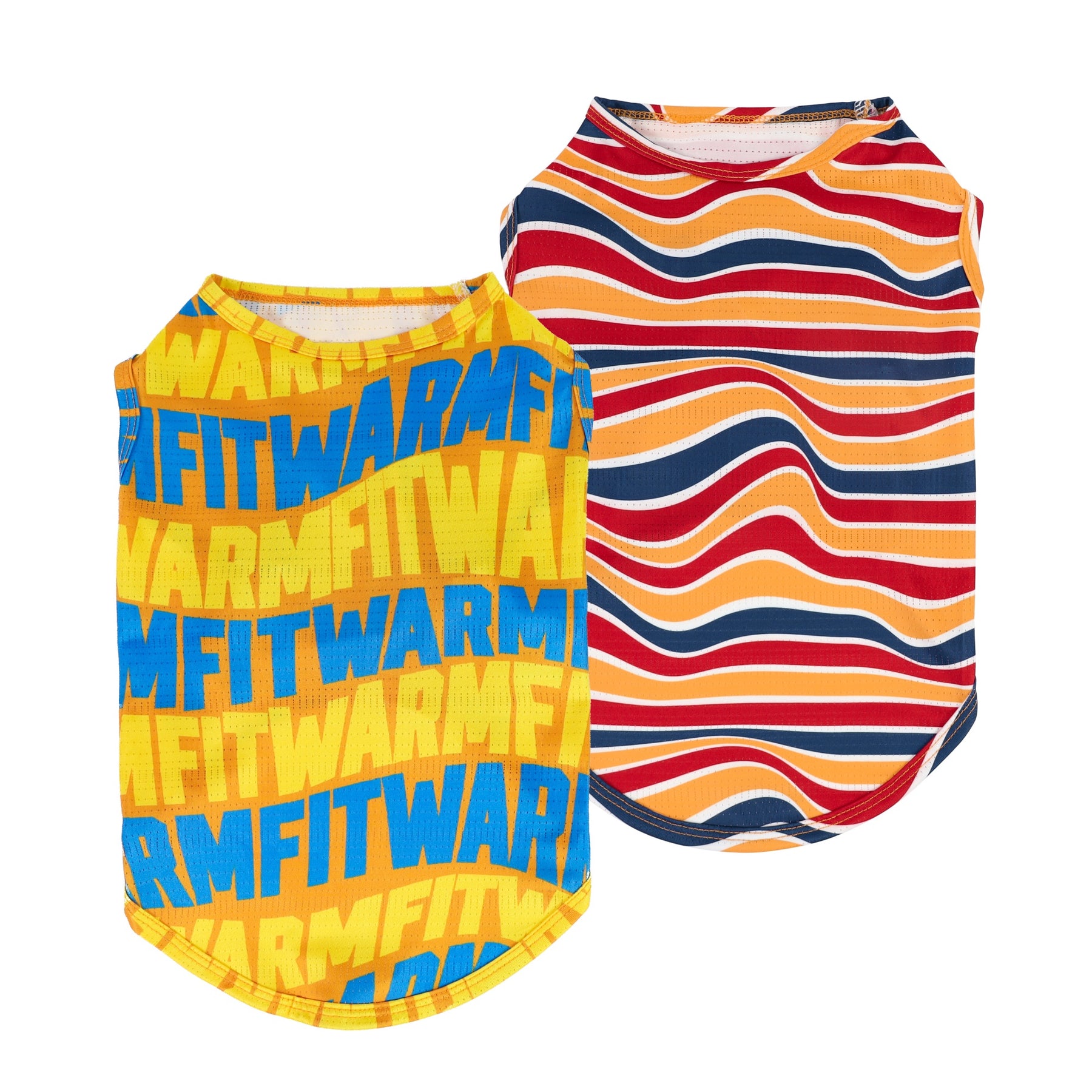 2-Pack Lightweight Dog T-Shirts. Yellow shirt with repeating "Fitwarm" text, plus striped dog shirt.