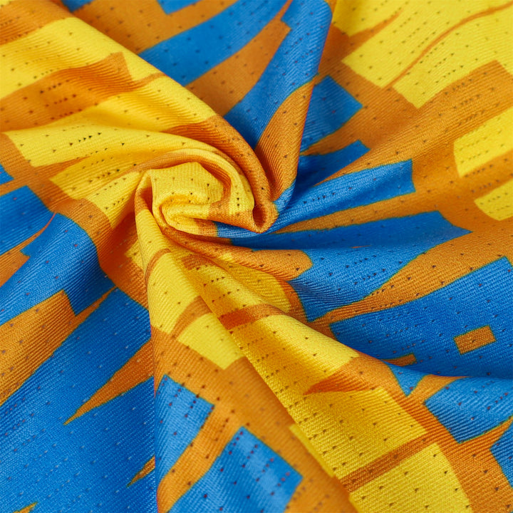 Fitwarm lightweight dog t-shirt fabric detail. Yellow, orange and blue abstract design, mesh material, breathable.