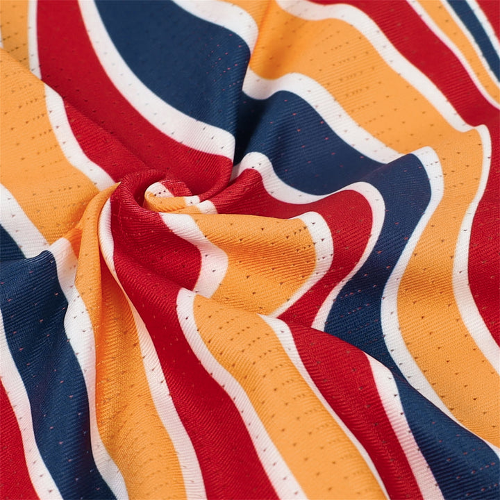 Fitwarm lightweight dog t-shirt fabric detail. Abstract wavy stripes in red, yellow, and blue with breathable mesh.