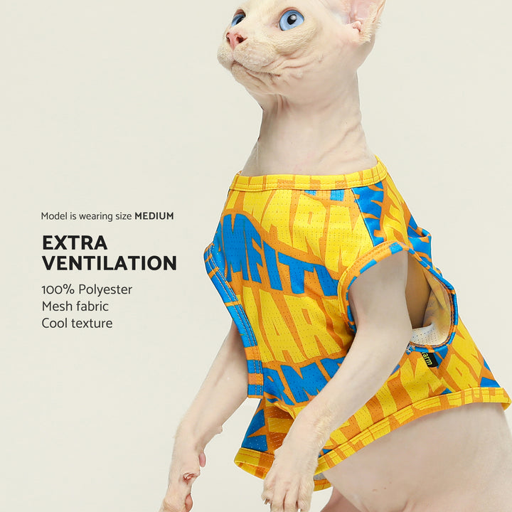 Fitwarm dog t-shirt on a cat. Yellow & blue printed mesh shirt, fits for all scenes.