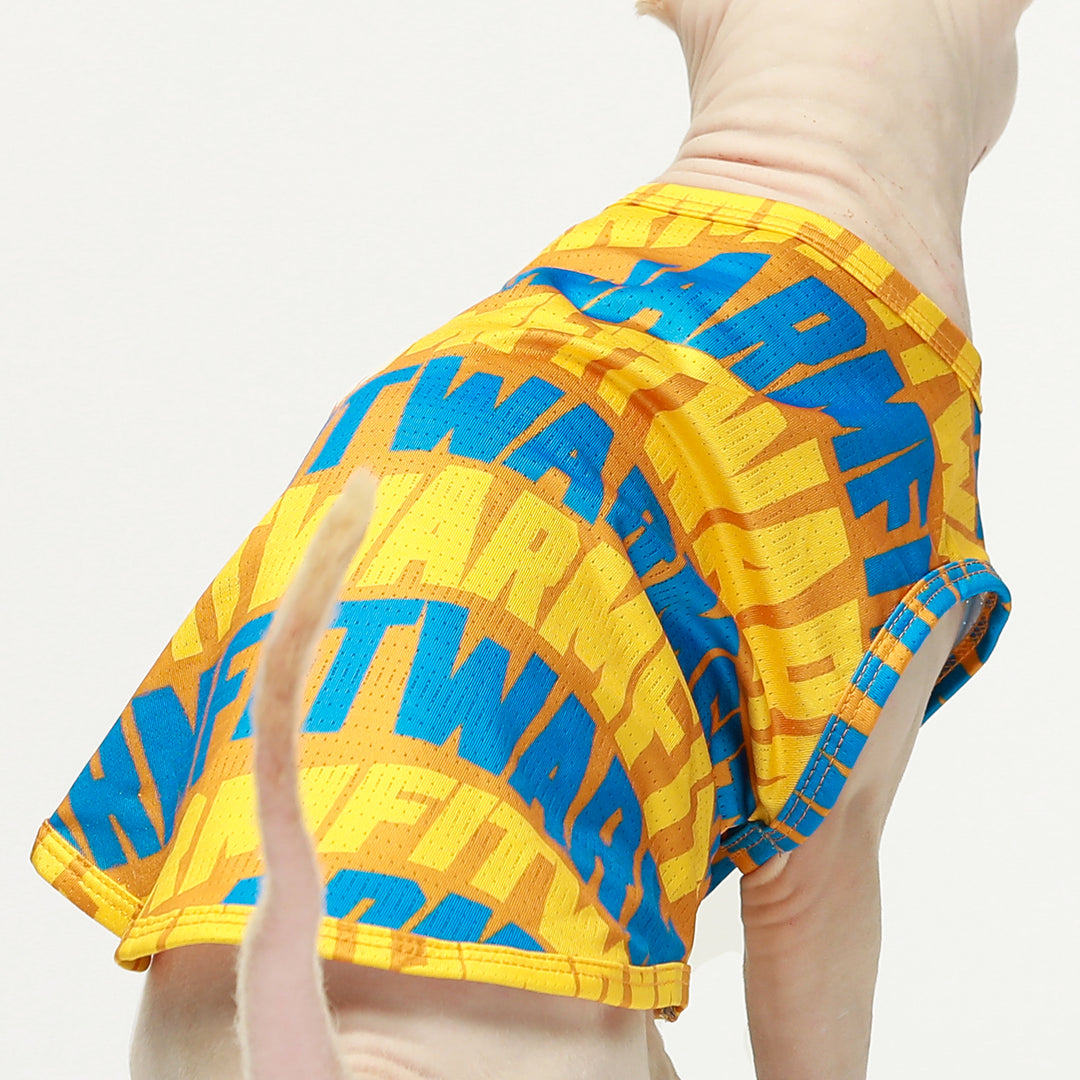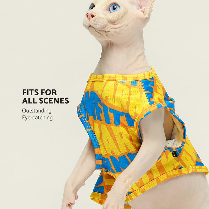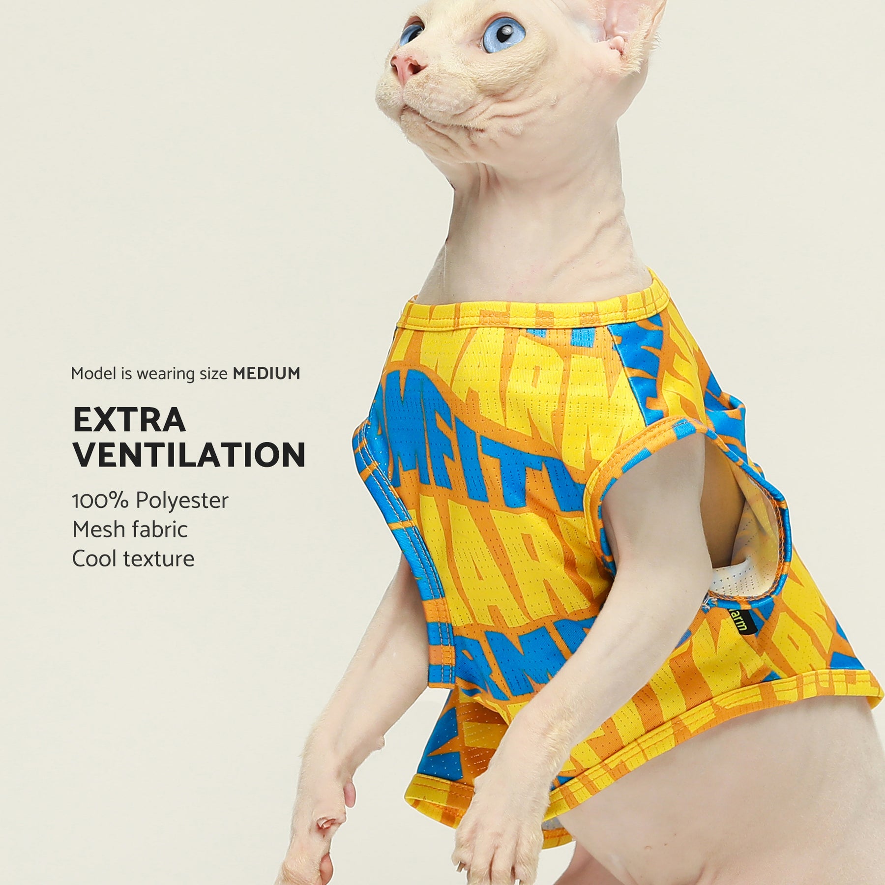 Fitwarm yellow dog t-shirt on Sphynx cat with mesh fabric. Abstract design and repeating Fitwarm print.