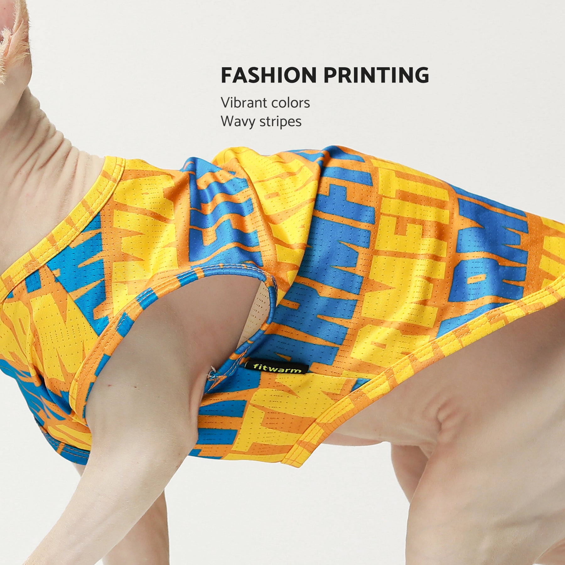 Fitwarm lightweight dog t-shirt on sphynx cat. Yellow and blue wavy stripe print. Mesh fabric, breathable.