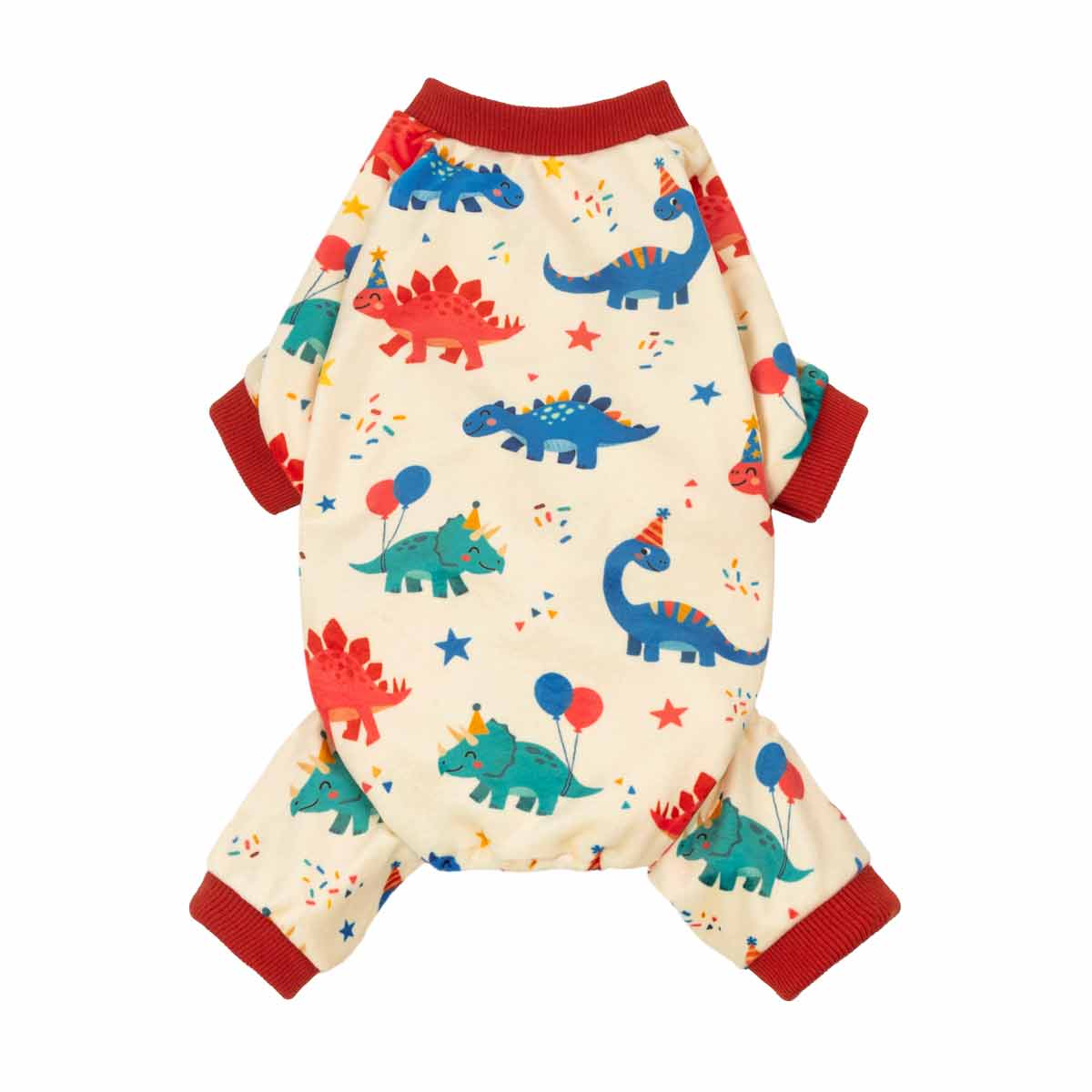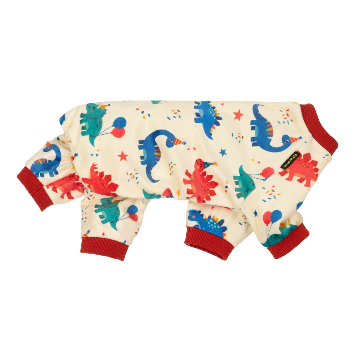 Dog pajamas with birthday themed dinosaur pattern on a white background