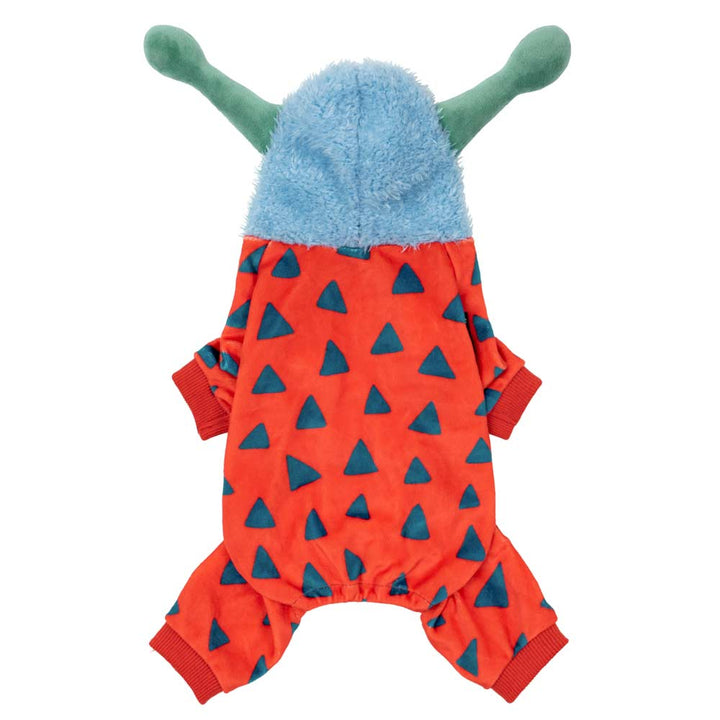 Hilarious red velvet dog monster Halloween costume with blue triangle print, fluffy blue hood, and funny antennae eyes.