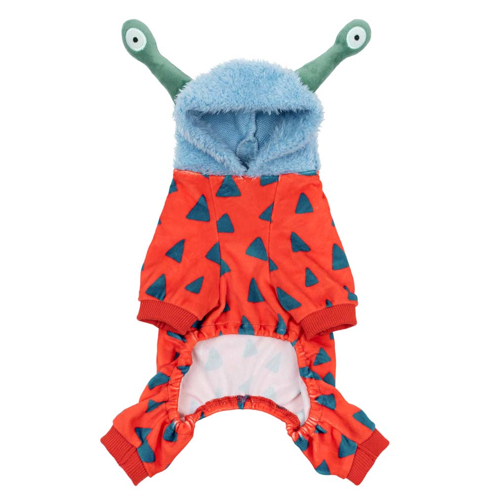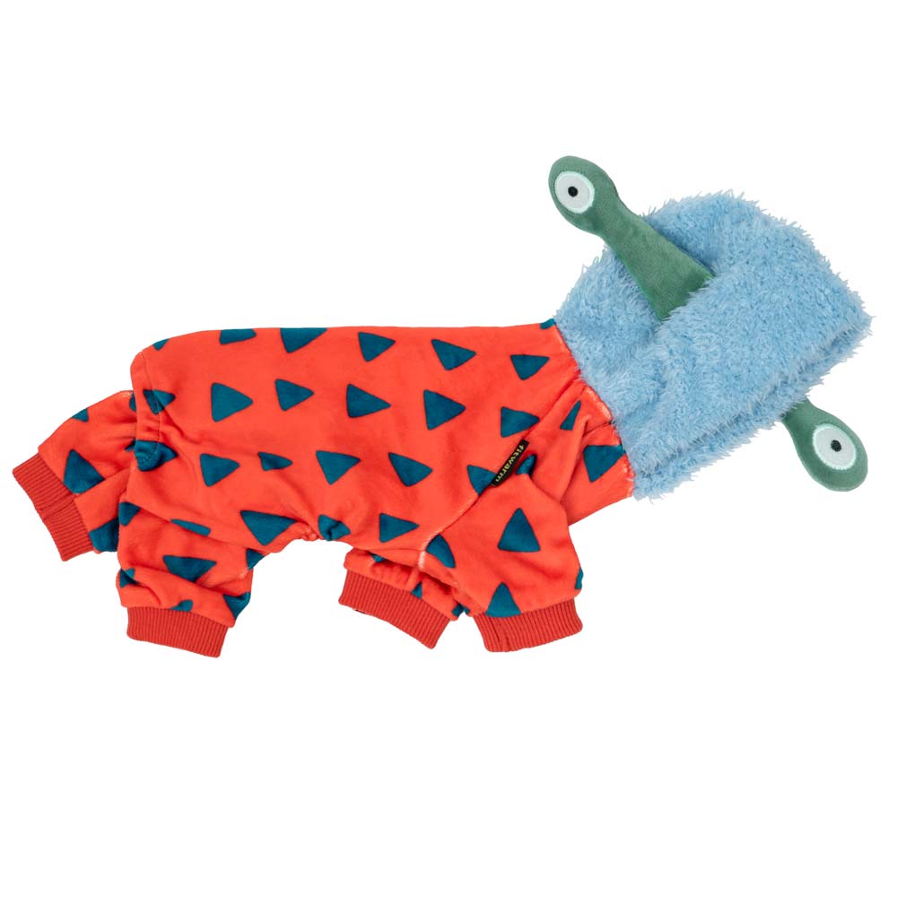 Dog Halloween costumes designed for playful frights and festive fun. Funny dog outfits covered in bold blue triangles pop against bright red velvet, paired with a fluffy monster hood and hilarious eyes for added mischief. Cosplay meets comfort in a unique full-body look built for spooky evenings and costume parades. Creative design brings out playful energy while adding a scary twist to Halloween celebrations.